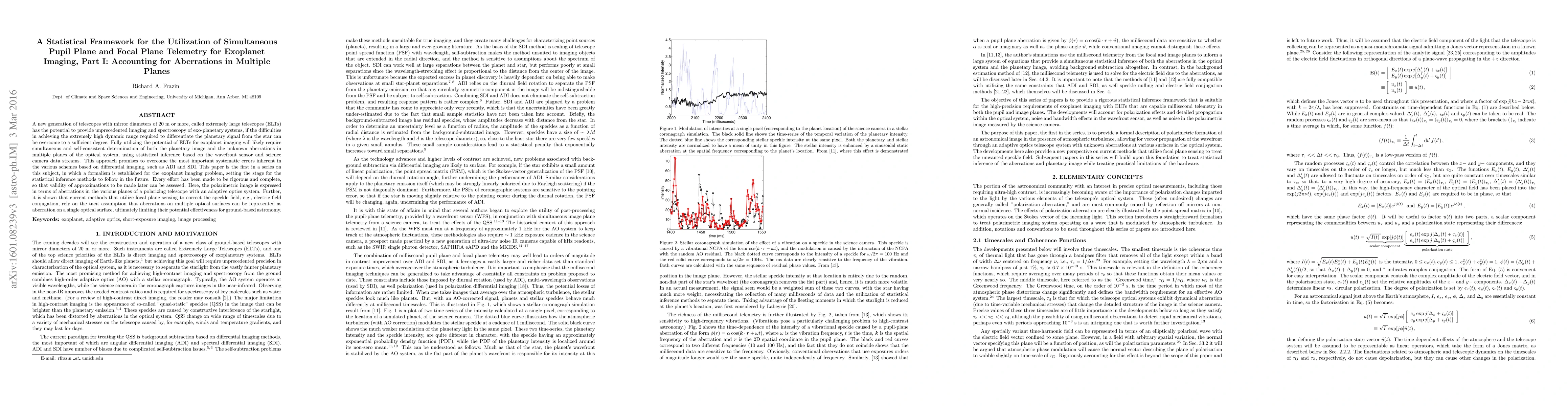A new generation of telescopes with mirror diameters of 20 m or more, called extremely large telescopes (ELTs) has the potential to provide unprecedented imaging and spectroscopy of exo-planetary systems, if the difficulties in achieving the extremely high dynamic range required to differentiate the planetary signal from the star can be overcome to a sufficient degree. Fully utilizing the potential of ELTs for exoplanet imaging will likely require simultaneous and self-consistent determination of both the planetary image and the unknown aberrations in multiple planes of the optical system, using statistical inference based on the wavefront sensor and science camera data streams. This approach promises to overcome the most important systematic errors inherent in the various schemes based on differential imaging, such as ADI and SDI. This paper is the first in a series on this subject, in which a formalism is established for the exoplanet imaging problem, setting the stage for the statistical inference methods to follow in the future. Every effort has been made to be rigorous and complete, so that validity of approximations to be made later can be assessed. Here, the polarimetric image is expressed in terms of aberrations in the various planes of a polarizing telescope with an adaptive optics system. Further, it is shown that current methods that utilize focal plane sensing to correct the speckle field, e.g., electric field conjugation, rely on the tacit assumption that aberrations on multiple optical surfaces can be represented as aberration on a single optical surface, ultimately limiting their potential effectiveness for ground-based astronomy.