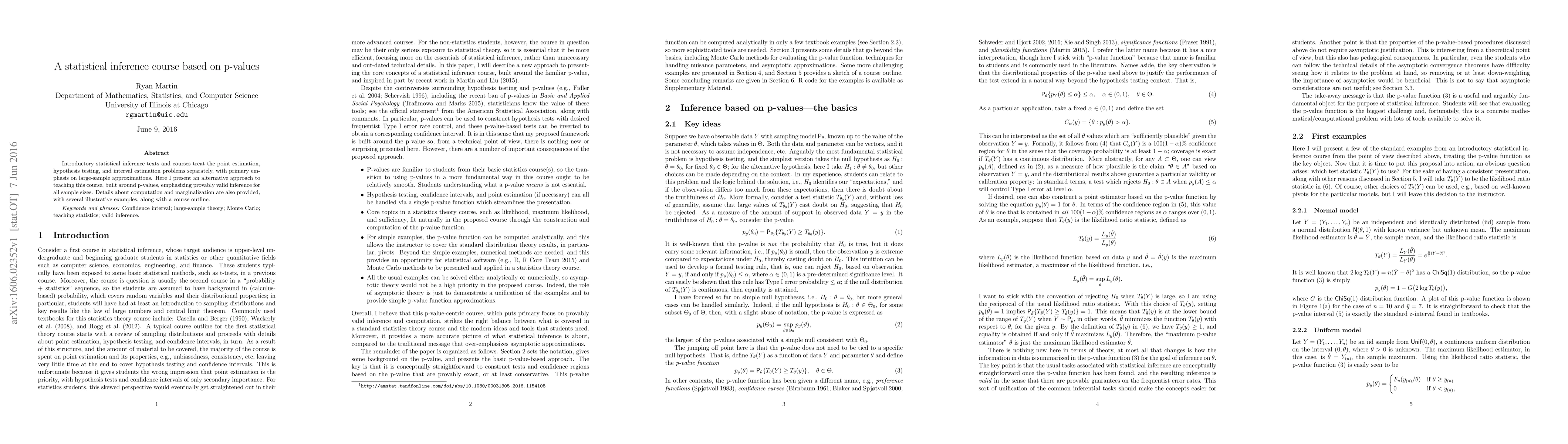 This paper proposes a novel approach to teaching statistical inference centered on p-values, emphasizing valid inference methods for all sample sizes rather than large-sample approximations. It includes details on computation, marginalization, and illustrative examples, along with a comprehensive course outline.