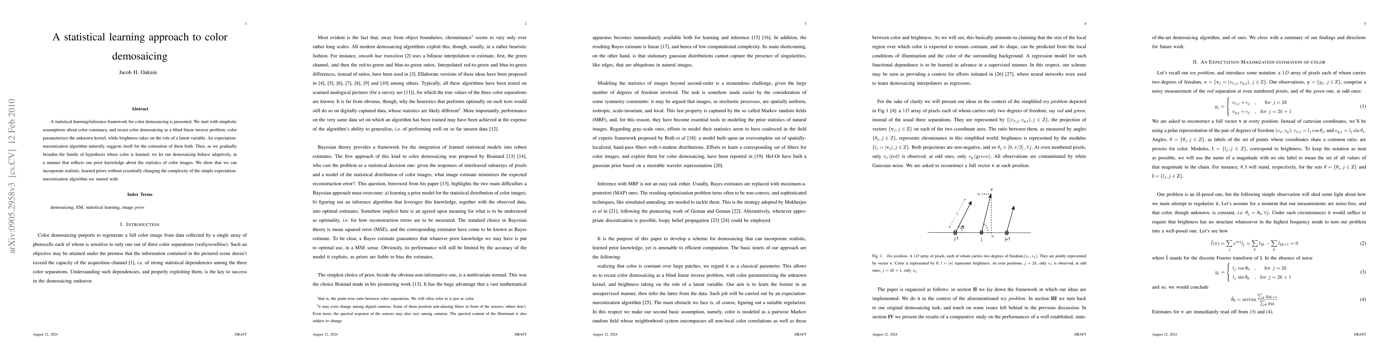 This paper presents a statistical learning approach to color demosaicing that improves image quality by adaptively incorporating prior knowledge about color statistics. It uses an expectation-maximization algorithm with learned priors to estimate color parameters and brightness.