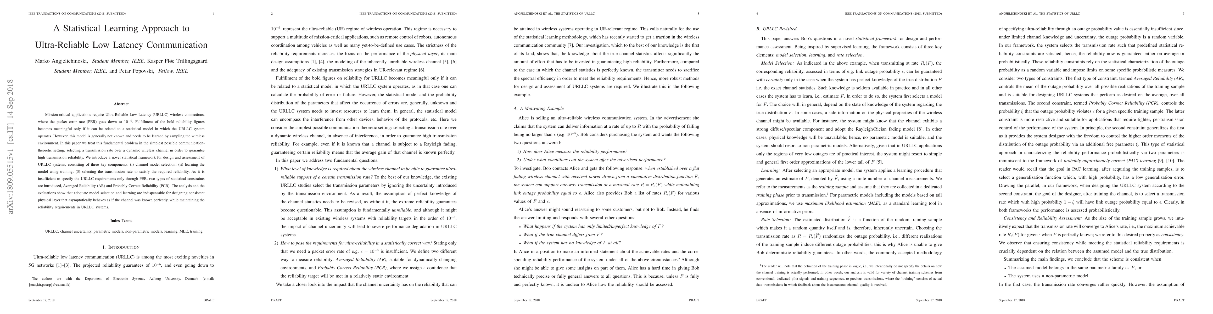 This paper proposes a statistical learning framework for designing Ultra-Reliable Low Latency Communication (URLLC) systems, focusing on selecting transmission rates to meet stringent reliability requirements. It introduces Averaged Reliability and Probably Correct Reliability as statistical constraints, alongside a method for channel model selection and learning.