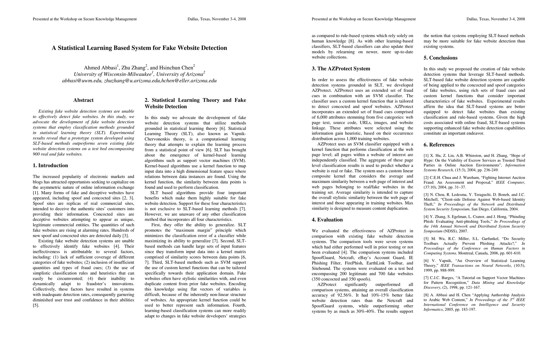 This study proposes a new fake website detection system based on statistical learning theory, demonstrating superior performance over seven existing systems in detecting 900 real and fake websites. The results highlight the effectiveness of classification methods grounded in statistical learning for this application.