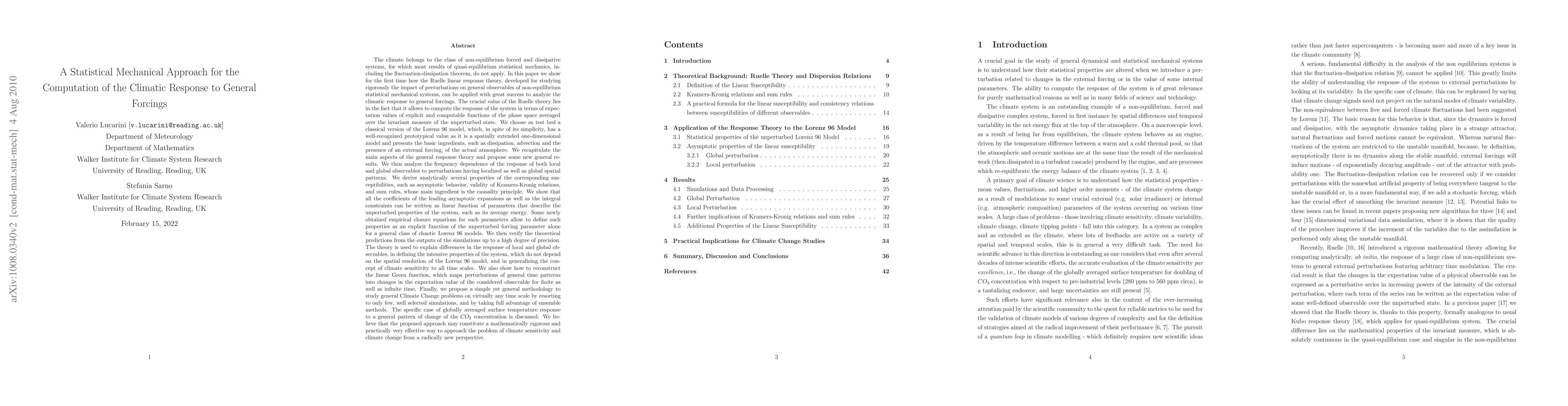 This paper applies Ruelle linear response theory from statistical mechanics to analyze the climatic response to general forcings using the Lorenz 96 model. It derives analytical results for frequency-dependent responses and generalizes climate sensitivity across time scales, offering a new methodology for studying climate change.