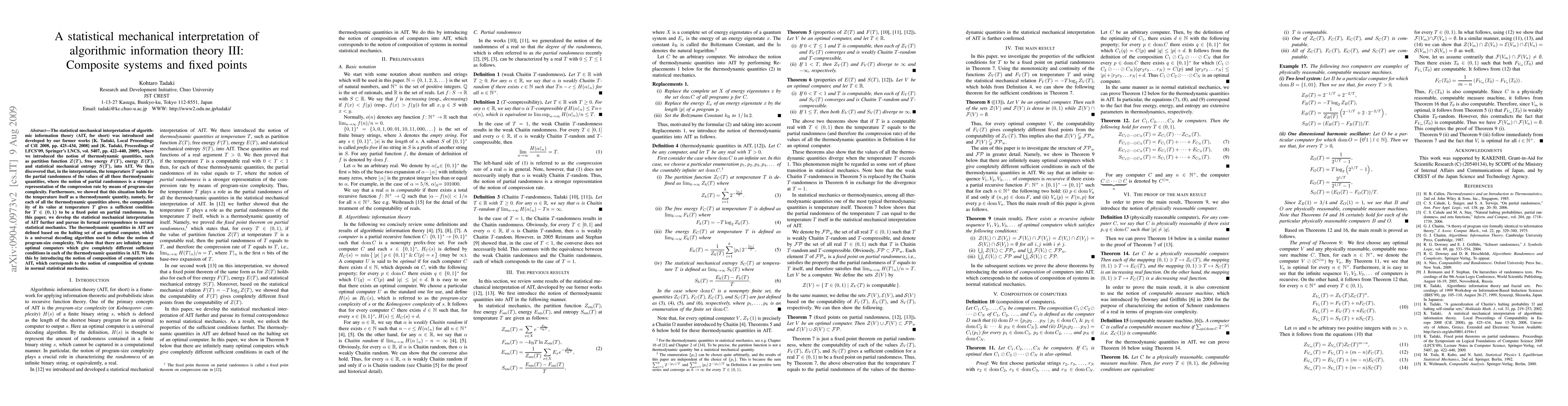 The statistical mechanical interpretation of algorithmic information theory (AIT, for short) was introduced and developed by our former works [K. Tadaki, Local Proceedings of CiE 2008, pp.425-434, 2008] and [K. Tadaki, Proceedings of LFCS'09, Springer's LNCS, vol.5407, pp.422-440, 2009], where we introduced the notion of thermodynamic quantities, such as partition function Z(T), free energy F(T), energy E(T), and statistical mechanical entropy S(T), into AIT. We then discovered that, in the interpretation, the temperature T equals to the partial randomness of the values of all these thermodynamic quantities, where the notion of partial randomness is a stronger representation of the compression rate by means of program-size complexity. Furthermore, we showed that this situation holds for the temperature itself as a thermodynamic quantity, namely, for each of all the thermodynamic quantities above, the computability of its value at temperature T gives a sufficient condition for T in (0,1) to be a fixed point on partial randomness. In this paper, we develop the statistical mechanical interpretation of AIT further and pursue its formal correspondence to normal statistical mechanics. The thermodynamic quantities in AIT are defined based on the halting set of an optimal computer, which is a universal decoding algorithm used to define the notion of program-size complexity. We show that there are infinitely many optimal computers which give completely different sufficient conditions in each of the thermodynamic quantities in AIT. We do this by introducing the notion of composition of computers into AIT, which corresponds to the notion of composition of systems in normal statistical mechanics.