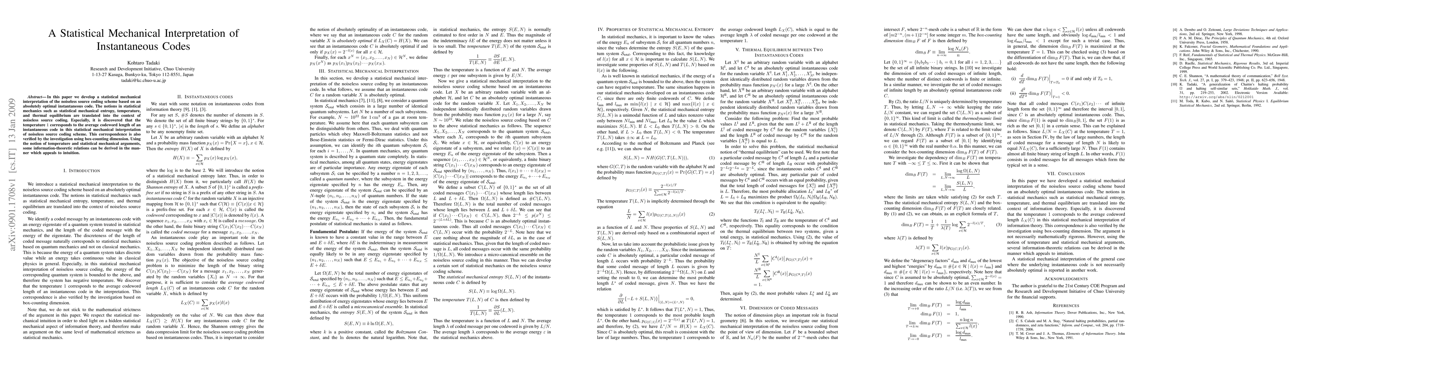 This paper develops a statistical mechanical interpretation of noiseless source coding, translating concepts like entropy, temperature, and thermal equilibrium into information theory. It finds that temperature 1 corresponds to the average codeword length of an optimal instantaneous code, verified through box-counting dimension, and uses these notions to derive intuitive information-theoretic relations.