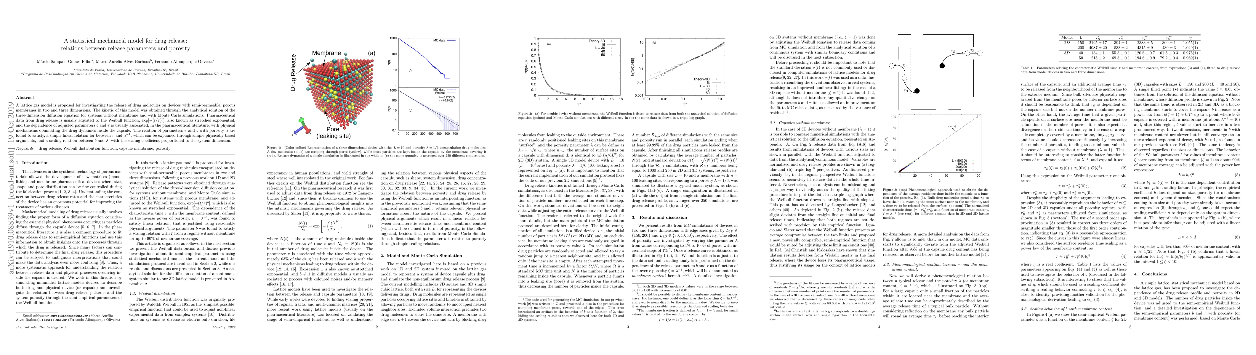This paper proposes a lattice gas model to study drug release through porous membranes, using analytical solutions and Monte Carlo simulations. It finds linear and scaling relationships between drug release parameters and porosity, providing insights into the physical mechanisms governing drug dynamics.
