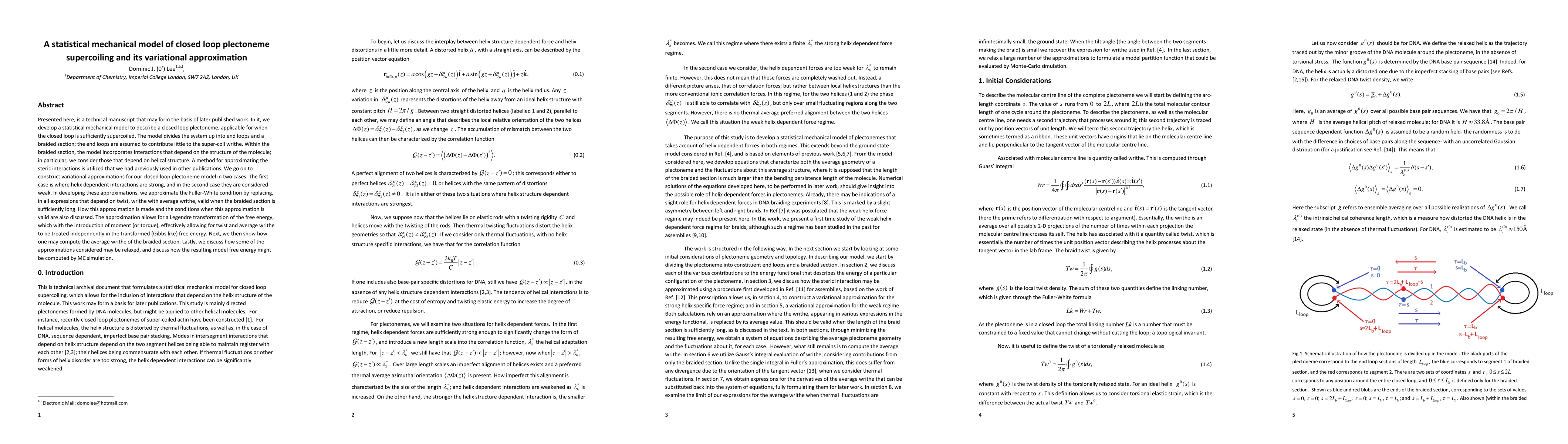 Presented here, is a technical manuscript that may form the basis of later published work. In it, we develop a statistical mechanical model to describe a closed loop plectoneme, applicable for when the closed loop is sufficiently supercoiled. The model divides the system up into end loops and a braided section; the end loops are assumed to contribute little to the super-coil writhe. Within the braided section, the model incorporates interactions that depend on the structure of the molecule; in particular, we consider those that depend on helical structure. A method for approximating the steric interactions is utilized that we had previously used in other publications. We go on to construct variational approximations for our closed loop plectoneme model in two cases. The first case is where helix dependent interactions are strong, and in the second case they are considered weak. In developing these approximations, we approximate the Fuller-White condition by replacing, in all expressions that depend on twist, writhe with average writhe, valid when the braided section is sufficiently long. How this approximation is made and the conditions when this approximation is valid are also discussed. The approximation allows for a Legendre transformation of the free energy, which with the introduction of moment (or torque), effectively allowing for twist and average writhe to be treated independently in the transformed (Gibbs like) free energy. Next, we then show how one may compute the average writhe of the braided section. Lastly, we discuss how some of the approximations considered may be relaxed, and discuss how the resulting model free energy might be computed by MC simulation.