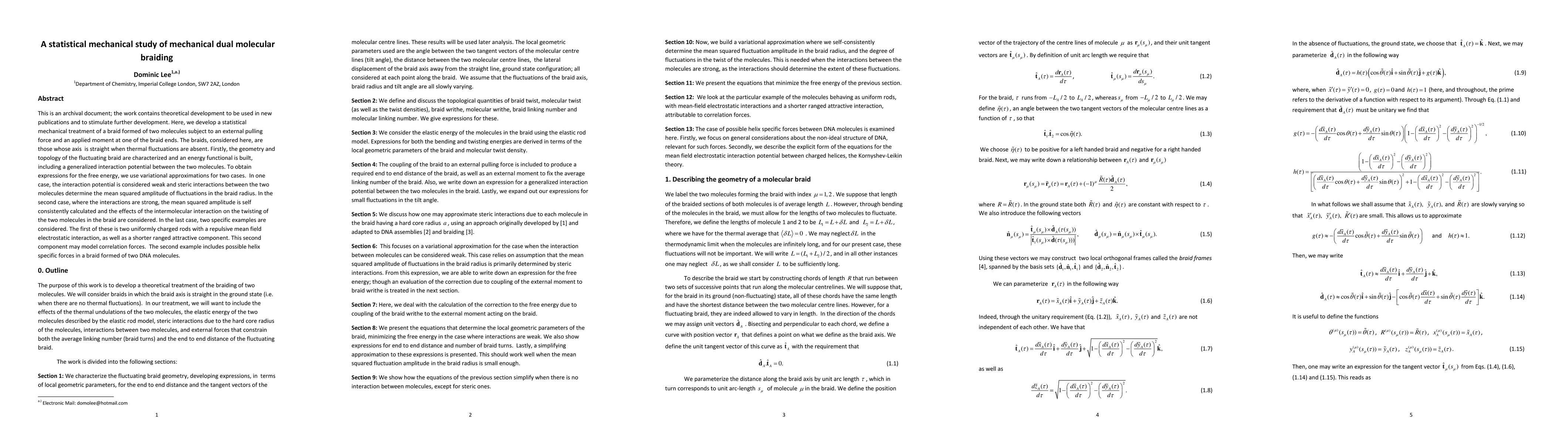This is an archival document; the work contains theoretical development to be used in new publications and to stimulate further development. Here, we develop a statistical mechanical treatment of a braid formed of two molecules subject to an external pulling force and an applied moment at one of the braid ends. The braids, considered here, are those whose axis is straight when thermal fluctuations are absent. Firstly, the geometry and topology of the fluctuating braid are characterized and an energy functional is built, including a generalized interaction potential between the two molecules. To obtain expressions for the free energy, we use variational approximations for two cases. In one case, the interaction potential is considered weak and steric interactions between the two molecules determine the mean squared amplitude of fluctuations in the braid radius. In the second case, where the interactions are strong, the mean squared amplitude is self consistently calculated and the effects of the intermolecular interaction on the twisting of the two molecules in the braid are considered. In the last case, two specific examples are considered. The first of these is two uniformly charged rods with a repulsive mean field electrostatic interaction, as well as a shorter ranged attractive component. This second component may model correlation forces. The second example includes possible helix specific forces in a braid formed of two DNA molecules.