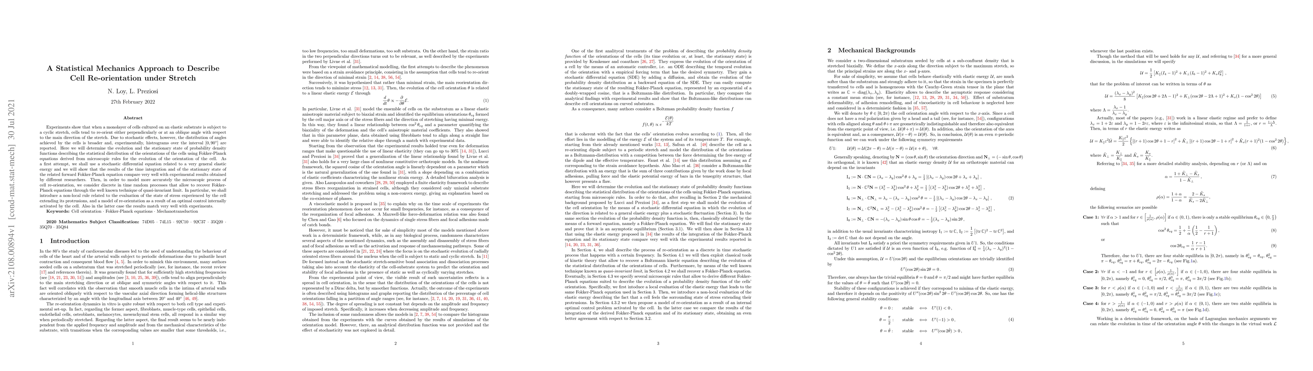 This paper employs statistical mechanics and Fokker-Planck equations to model cell re-orientation under cyclic stretch on an elastic substrate. The study compares theoretical predictions from stochastic differential equations and optimal control models to experimental histograms, demonstrating strong agreement.