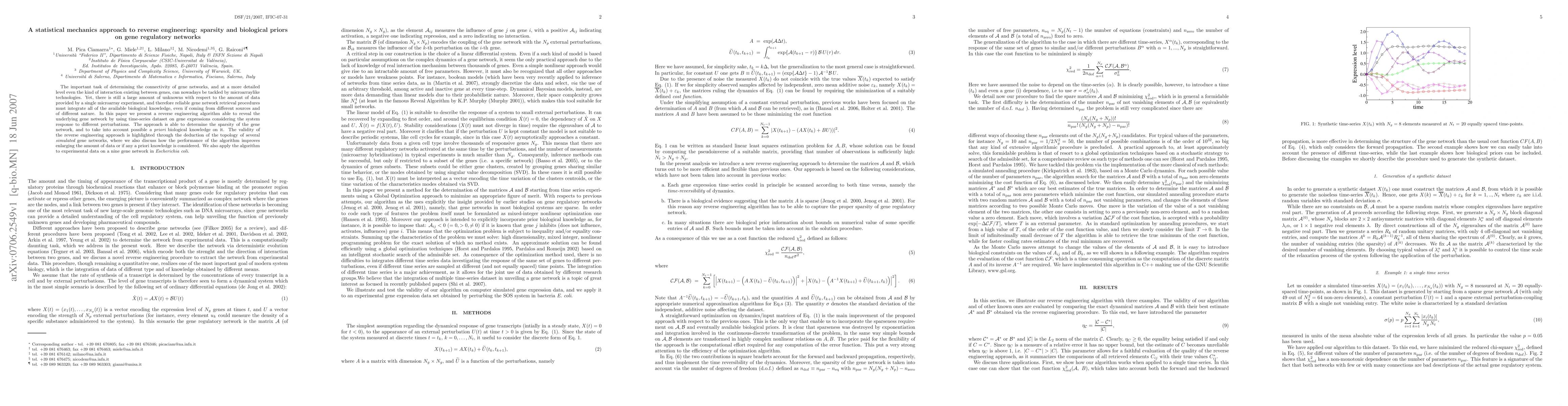 This paper proposes a statistical mechanics approach for reverse engineering gene regulatory networks using time-series gene expression data. The method determines network sparsity and incorporates biological priors to improve network reconstruction accuracy, validated through simulated and real Escherichia coli gene networks.