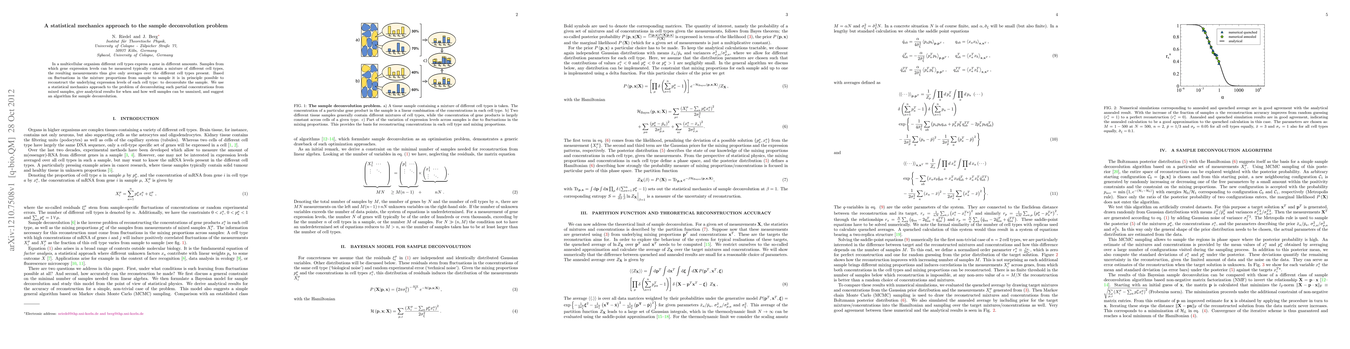 In a multicellular organism different cell types express a gene in different amounts. Samples from which gene expression levels can be measured typically contain a mixture of different cell types, the resulting measurements thus give only averages over the different cell types present. Based on fluctuations in the mixture proportions from sample to sample it is in principle possible to reconstruct the underlying expression levels of each cell type: to deconvolute the sample. We use a statistical mechanics approach to the problem of deconvoluting such partial concentrations from mixed samples, give analytical results for when and how well samples can be unmixed, and suggest an algorithm for sample deconvolution.