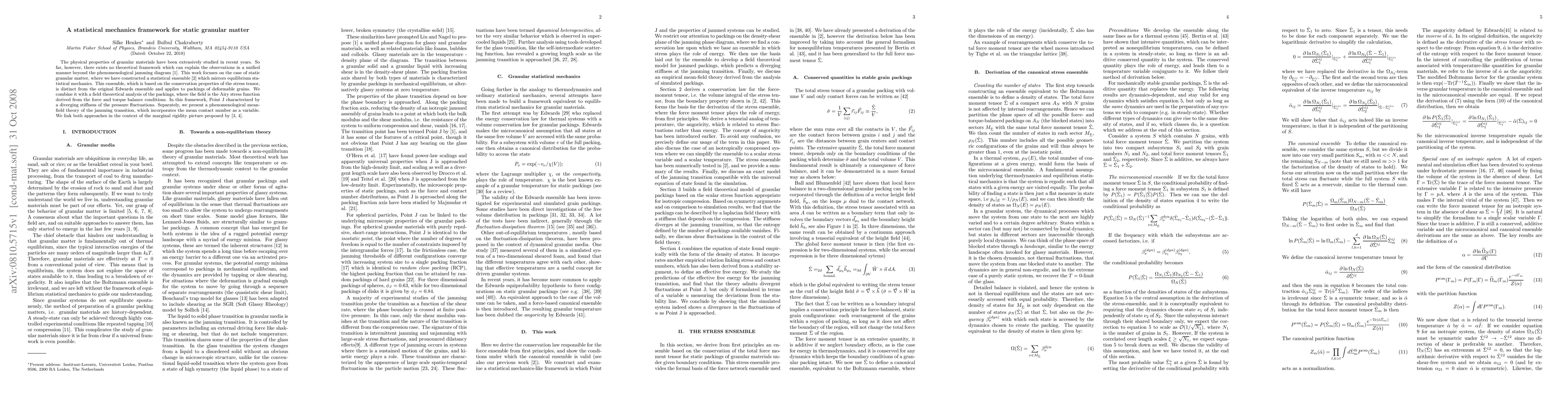 This paper constructs a statistical mechanics framework for static granular matter, based on a new ensemble that mirrors equilibrium statistical mechanics and applies to deformable grains. It combines this ensemble with a field theoretical analysis to explore the jamming transition and the diverging stiffness of pressure fluctuations at Point J.
