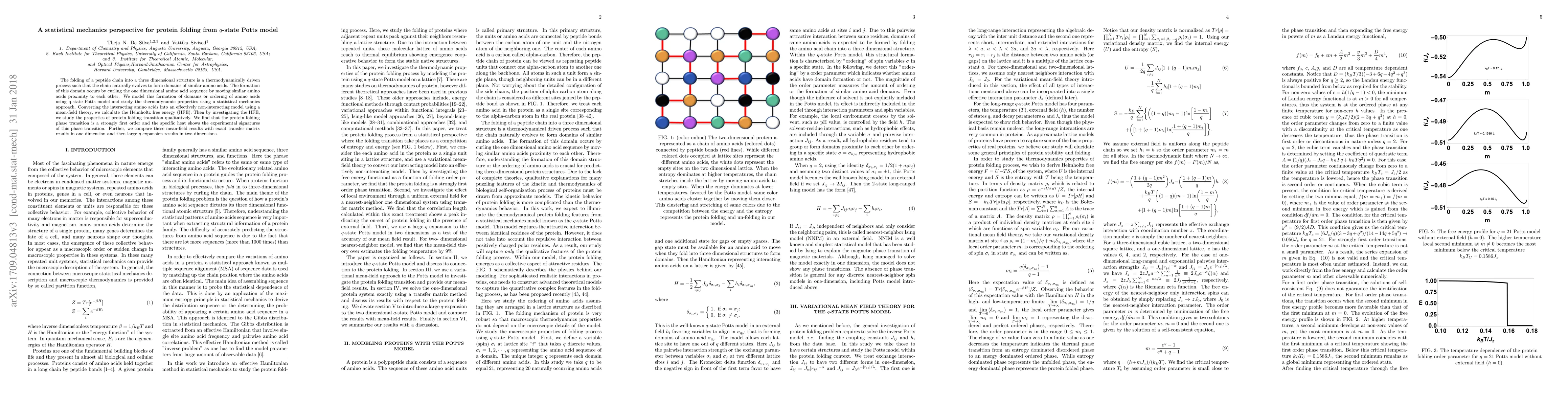 The folding of a peptide chain into a three dimensional structure is a thermodynamically driven process such that the chain naturally evolves to form domains of similar amino acids. The formation of this domain occurs by curling the one dimensional amino acid sequence by moving similar amino acids proximity to each other. We model this formation of domains or ordering of amino acids using q-state Potts model and study the thermodynamic properties using a statistical mechanics approach. Converting the interacting amino acids into an effectively non-interacting model using a mean-field theory, we calculate the Helmholtz free energy (HFE). Then by investigating the HFE, we study the properties of protein folding transition qualitatively. We find that the protein folding phase transition is a strongly first order and the specific heat shows the experimental signatures of this phase transition. Further, we compare these mean-field results with exact transfer matrix results in one dimension and then large $q$ expansion results in two dimensions.