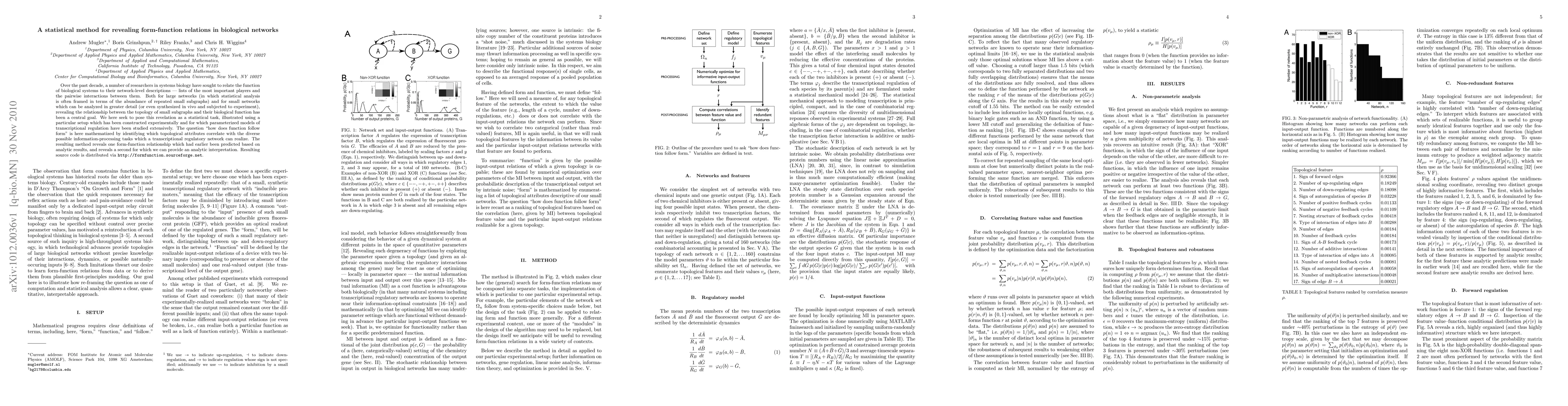 Over the past decade, a number of researchers in systems biology have sought to relate the function of biological systems to their network-level descriptions -- lists of the most important players and the pairwise interactions between them. Both for large networks (in which statistical analysis is often framed in terms of the abundance of repeated small subgraphs) and for small networks which can be analyzed in greater detail (or even synthesized in vivo and subjected to experiment), revealing the relationship between the topology of small subgraphs and their biological function has been a central goal. We here seek to pose this revelation as a statistical task, illustrated using a particular setup which has been constructed experimentally and for which parameterized models of transcriptional regulation have been studied extensively. The question "how does function follow form" is here mathematized by identifying which topological attributes correlate with the diverse possible information-processing tasks which a transcriptional regulatory network can realize. The resulting method reveals one form-function relationship which had earlier been predicted based on analytic results, and reveals a second for which we can provide an analytic interpretation. Resulting source code is distributed via http://formfunction.sourceforge.net.
