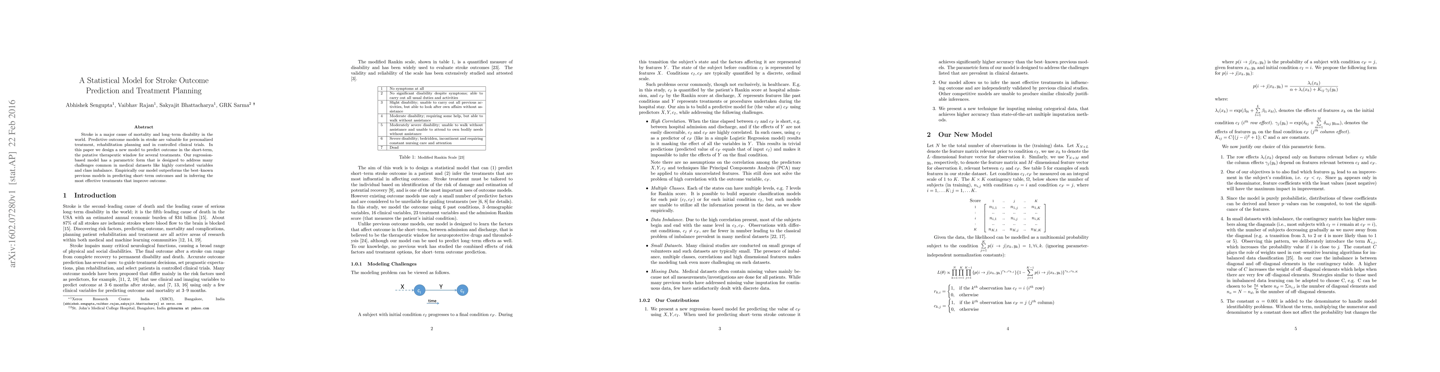 This paper introduces a new regression-based statistical model for predicting short-term stroke outcomes and determining effective treatment plans, outperforming previous models by addressing issues like correlated variables and class imbalance. The model's success enhances personalized treatment and rehabilitation strategies.