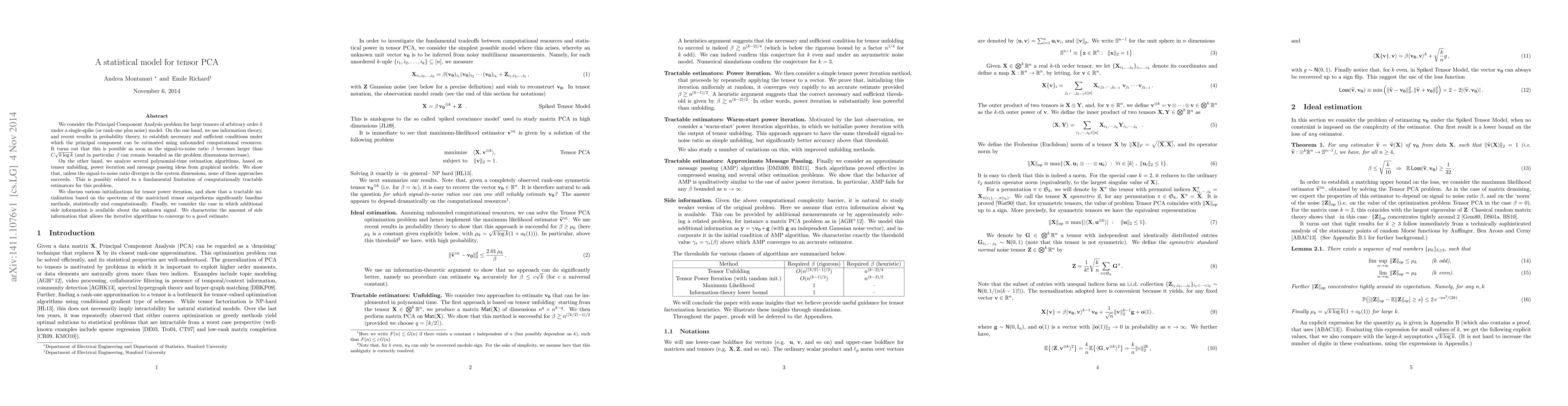 Researchers developed a statistical model for tensor PCA and showed that a single-spike signal can be estimated with unbounded computational resources when the signal-to-noise ratio exceeds a certain threshold.