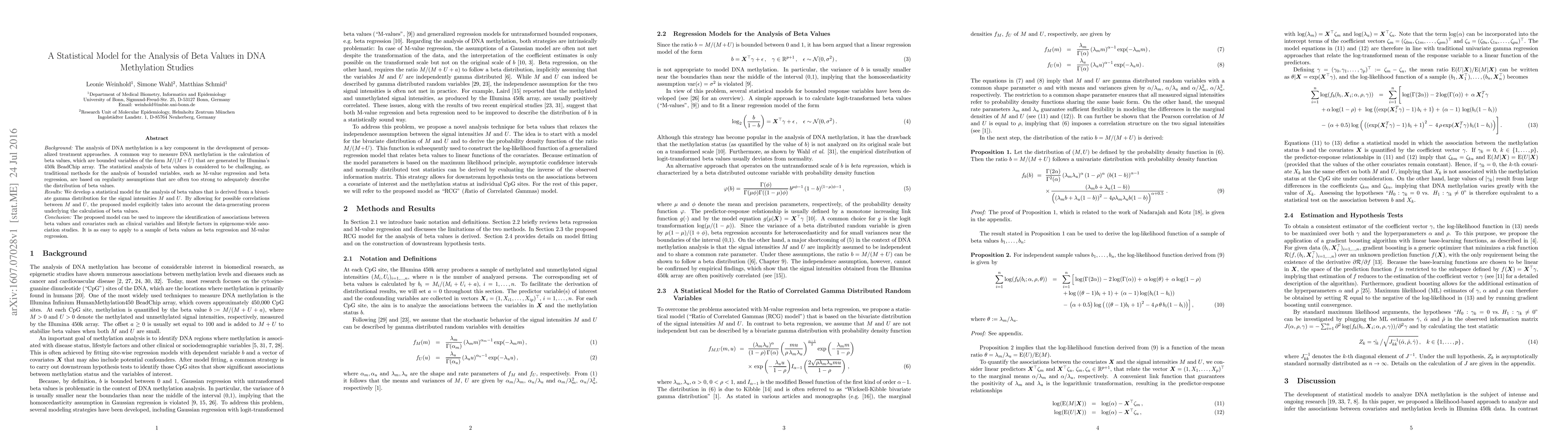 This paper develops a statistical model based on a bivariate gamma distribution for analyzing beta values in DNA methylation studies, addressing the challenges of traditional methods by accounting for correlations in signal intensities. The new model enhances the identification of associations between beta values and covariates in epigenome-wide association studies.