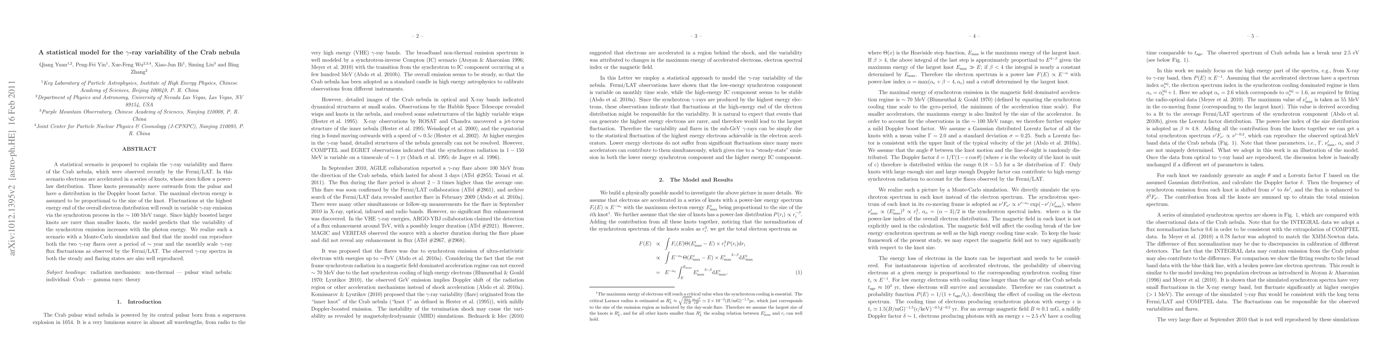 A statistical model explains gamma-ray variability of the Crab nebula by proposing electrons accelerated in knots with varying sizes and energy levels, reproducing observed flares and flux fluctuations.