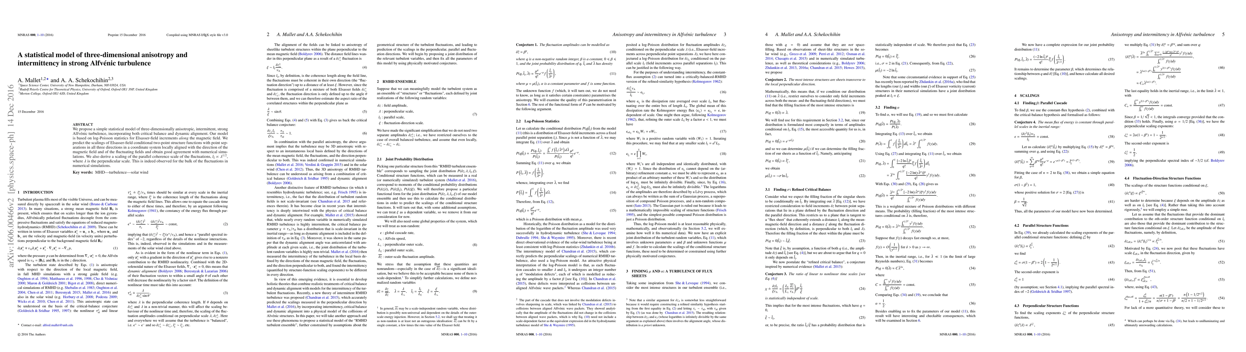 This paper proposes a statistical model for three-dimensional anisotropic and intermittent strong Alfvénic turbulence, incorporating critical balance and dynamic alignment. It predicts scalings for Elsasser-field increments and shows good agreement with numerical simulations, including a derived coherence scale scaling $l_\parallel \propto \lambda^{1/2}$.