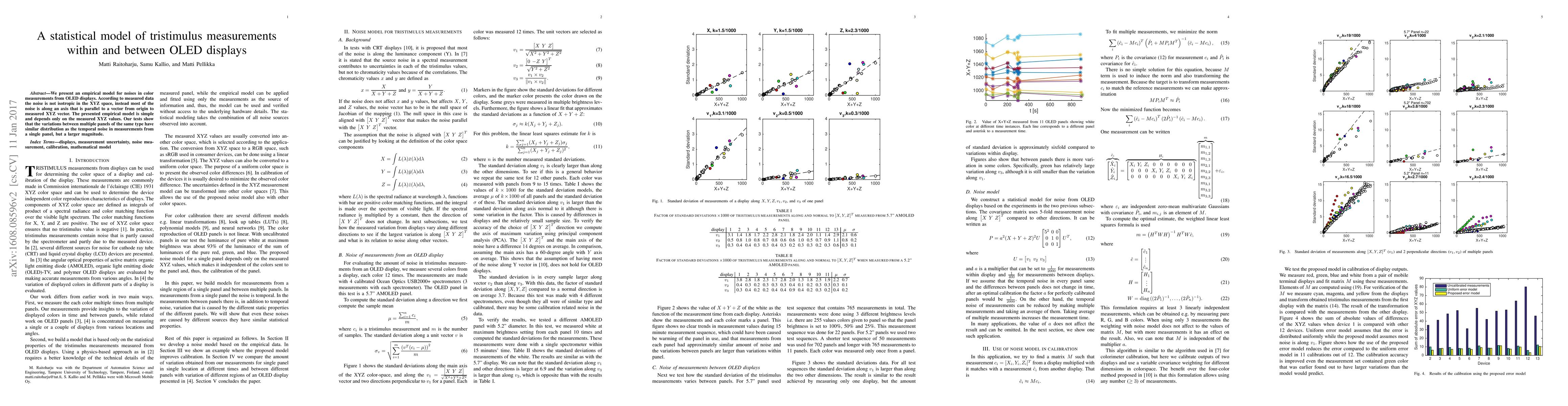 Summary: This paper introduces a simple empirical model to describe the anisotropic noise in tristimulus measurements from OLED displays, showing that noise is greatest along a vector from the origin to the measured XYZ value. Tests reveal that variations between different OLED panels exhibit similar noise distribution as the temporal noise within a single panel but with greater magnitude.