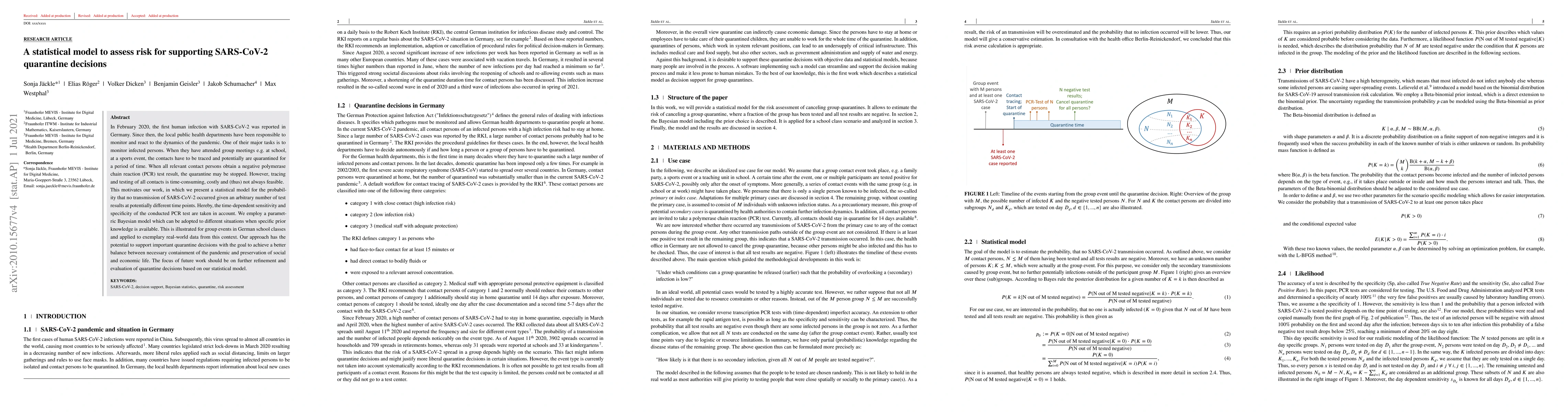 In February 2020 the first human infection with SARS-CoV-2 was reported in Germany. Since then the local public health offices have been responsible to monitor and react to the dynamics of the pandemic. One of their major tasks is to contain the spread of the virus after potential spreading events, for example when one or multiple participants have a positive test result after a group meeting (e.g. at school, at a sports event or at work). In this case, contacts of the infected person have to be traced and potentially are quarantined (at home) for a period of time. When all relevant contact persons obtain a negative polymerase chain reaction (PCR) test result, the quarantine may be stopped. However, tracing and testing of all contacts is time-consuming, costly and (thus) not always feasible. This motivates our work, in which we present a statistical model for the probability that no transmission of Sars-CoV-2 occurred given an arbitrary number of test results at potentially different timepoints. Hereby, the time-dependent sensitivity and specificity of the conducted PCR test are taken in account. We employ a parametric Bayesian model which can be adopted to different situations when specific prior knowledge is available. This is illustrated for group events in German school classes and applied to exemplary real-world data from this context. Our approach has the potential to support important quarantine decisions with the goal to achieve a better balance between necessary containment of the pandemic and preservation of social and economic life. The focus of future work should be on further refinement and evaluation of quarantine decisions based on our statistical model.
