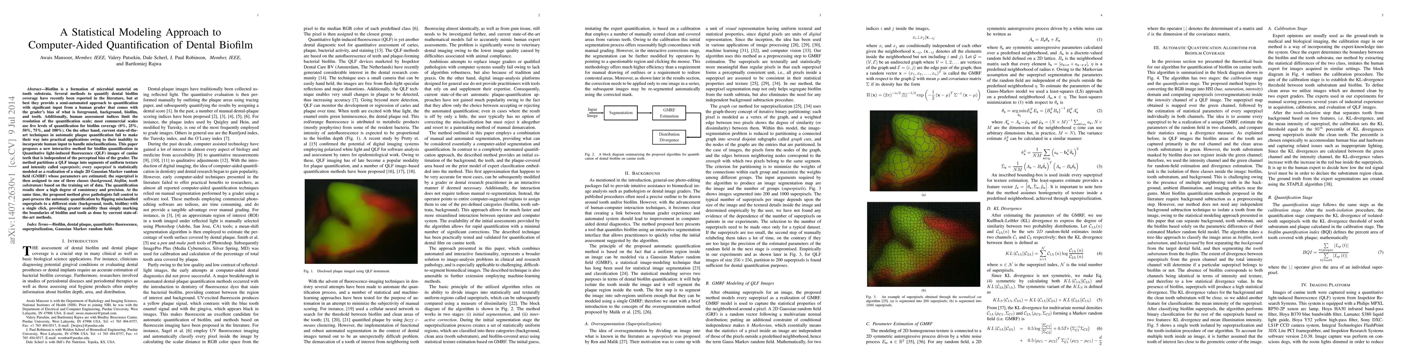 This paper introduces a statistical modeling approach for computer-aided quantification of dental biofilm using QLF images, employing superpixels and Gaussian Markov random fields to classify regions into background, biofilm, or tooth. The method offers precise quantification and allows pathologists to correct misclassifications easily.