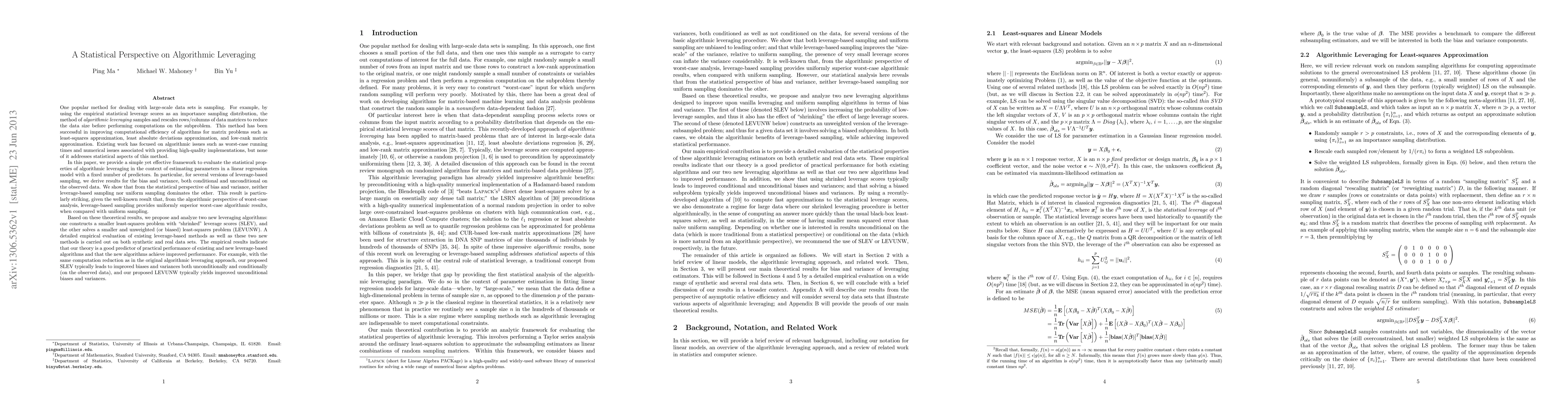 This paper evaluates the statistical properties of algorithmic leveraging for large-scale data sets, showing that neither leverage-based nor uniform sampling consistently outperforms the other in terms of bias and variance. It proposes and analyzes two new leveraging algorithms, which empirically demonstrate improved performance over existing methods.