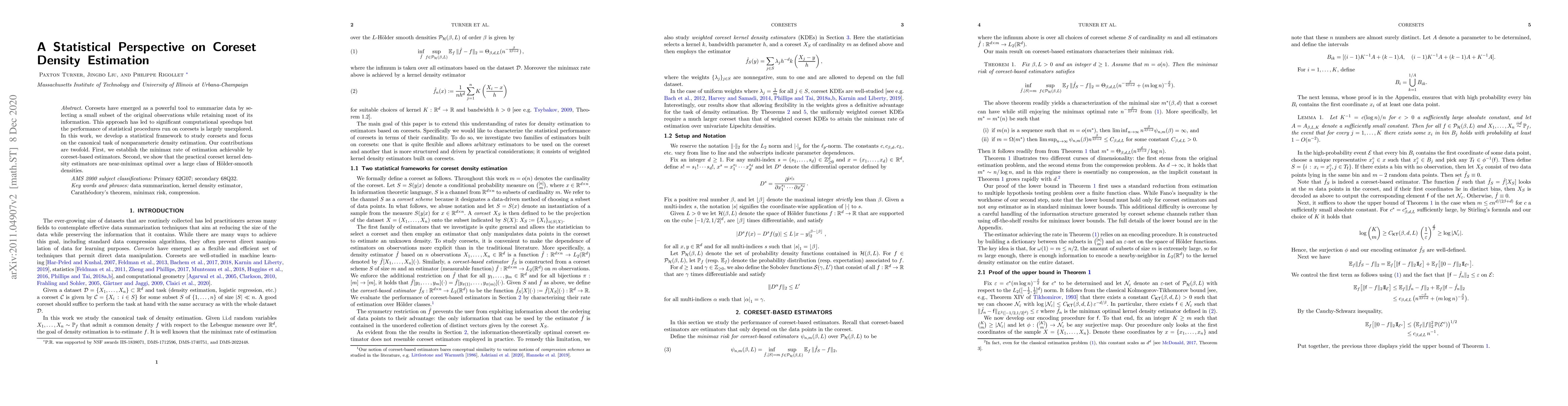 Researchers developed a statistical framework to study coresets for data summarization, showing that coreset-based estimators can achieve near-minimax optimal performance in nonparametric density estimation. This improvement could lead to significant computational speedups in statistical procedures on summarized data.