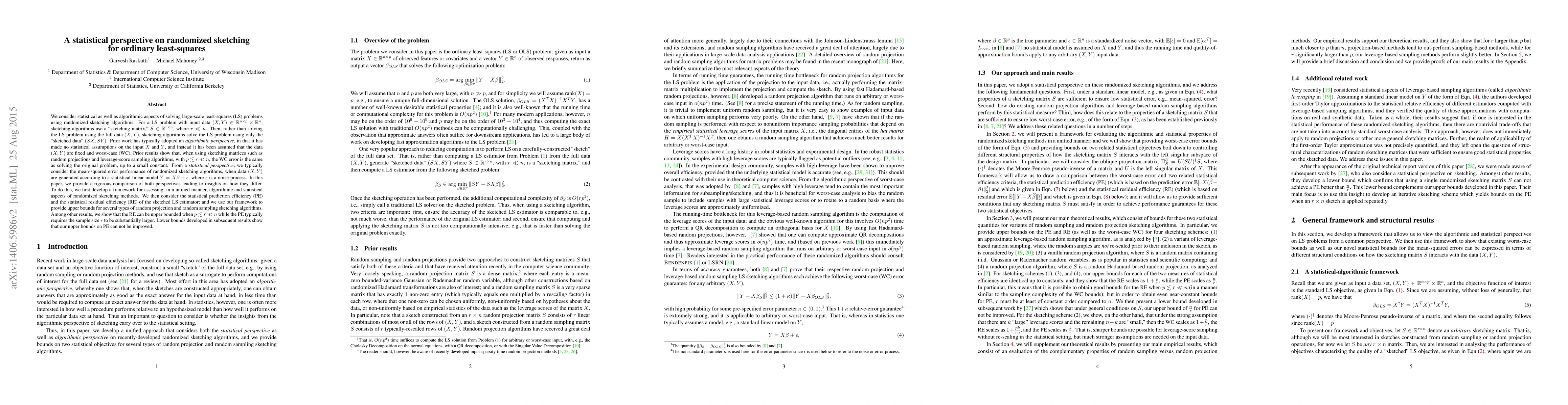 This paper explores both statistical and algorithmic perspectives on solving large-scale least-squares problems using randomized sketching. It develops a framework for comparing these perspectives, showing that while statistical residual efficiency can be achieved with small $r$, statistical prediction efficiency often requires larger $r$, and provides rigorous upper bounds for various sketching algorithms.