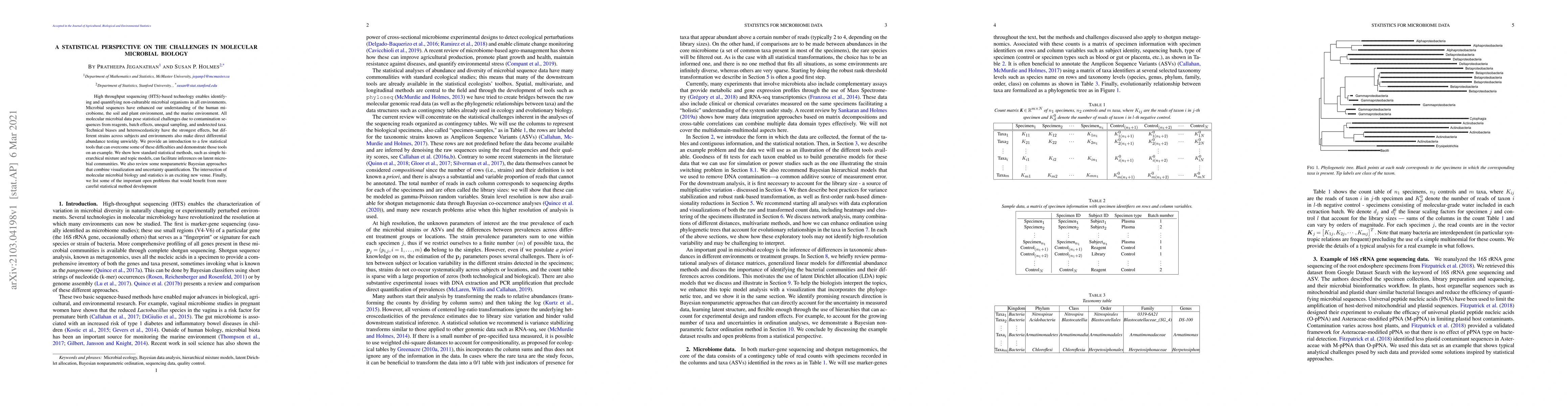 This paper discusses the statistical challenges in molecular microbial biology, particularly from high throughput sequencing data, including contamination, batch effects, and technical biases. It introduces statistical tools like hierarchical mixture and topic models to address these issues, highlighting the potential for further development in this interdisciplinary field.