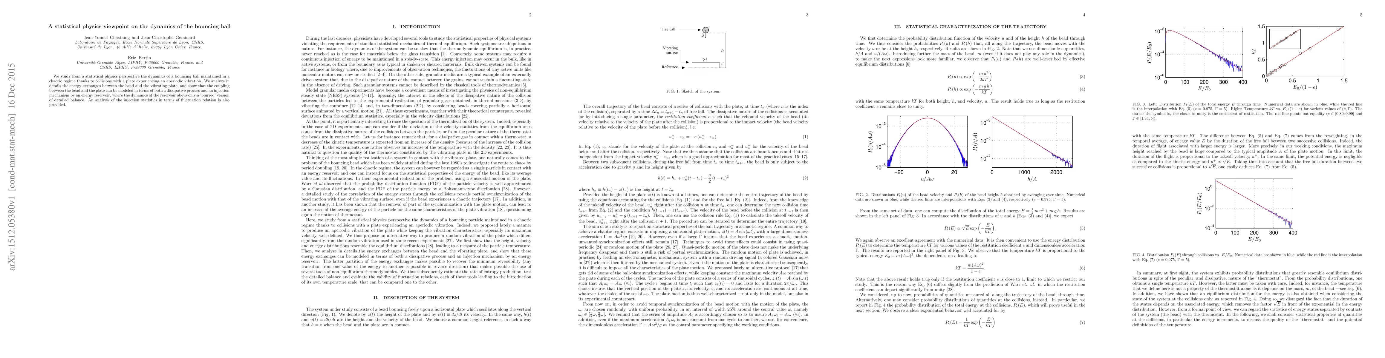 We study from a statistical physics perspective the dynamics of a bouncing ball maintained in a chaotic regime thanks to collisions with a plate experiencing an aperiodic vibration. We analyze in details the energy exchanges between the bead and the vibrating plate, and show that the coupling between the bead and the plate can be modeled in terms of both a dissipative process and an injection mechanism by an energy reservoir, where the dynamics of the reservoir obeys only a 'blurred' version of detailed balance. An analysis of the injection statistics in terms of fluctuation relation is also provided.