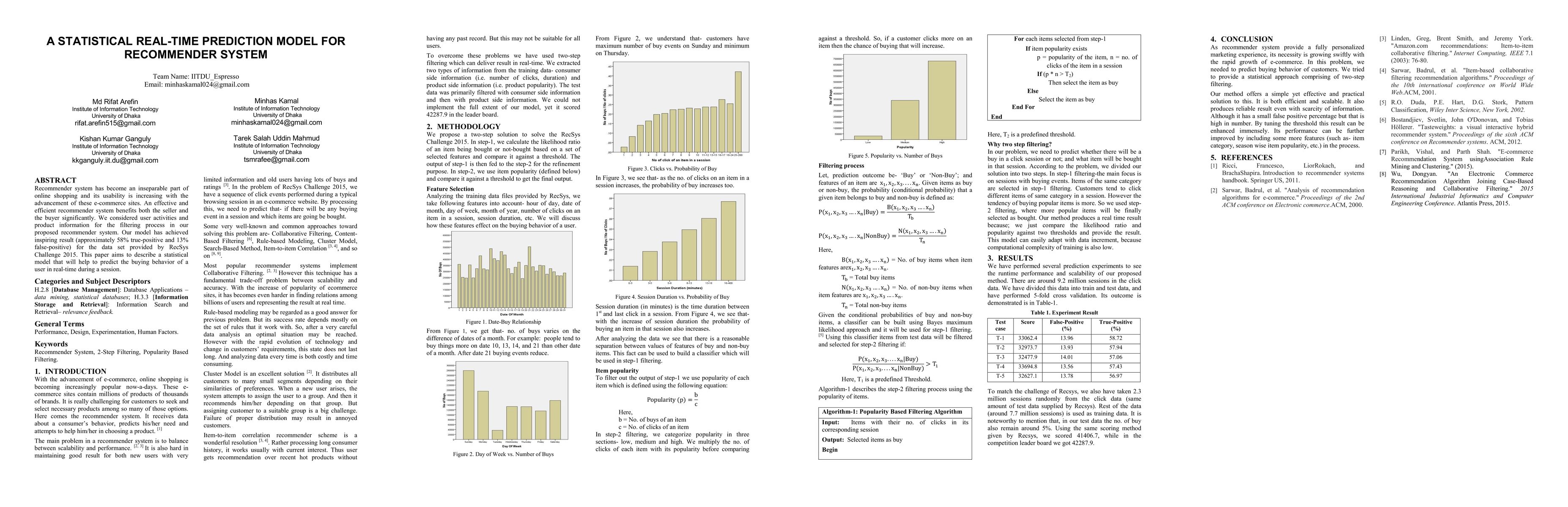 This paper proposes a statistical real-time prediction model for recommender systems that leverages user activities and product information to enhance e-commerce usability. The model achieved a 58% true-positive rate and a 13% false-positive rate on the RecSys Challenge 2015 dataset.