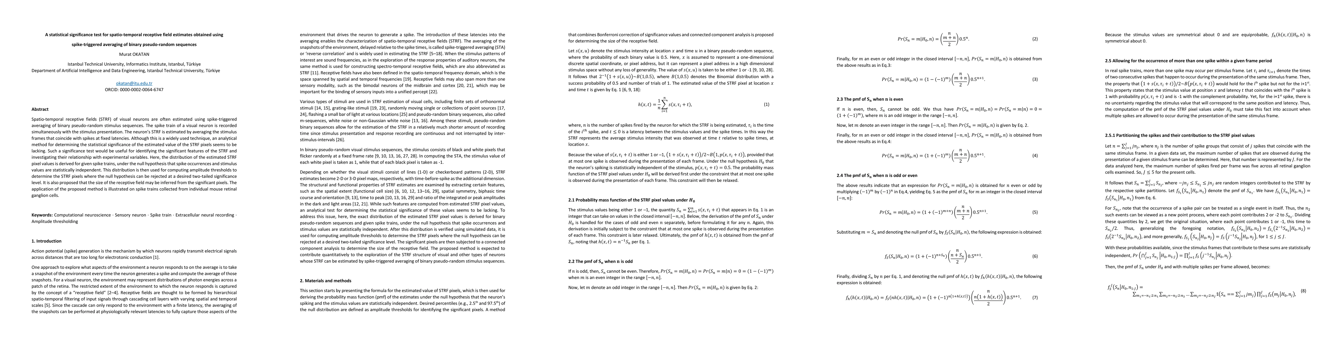 This paper develops a statistical significance test for spatio-temporal receptive field (STRF) estimates obtained from spike-triggered averaging of binary pseudo-random sequences, providing a method to determine significant STRF pixels and infer receptive field size. The test derives pixel value distributions under the null hypothesis of independence, enabling significance level determination and feature analysis in visual neuron recordings.