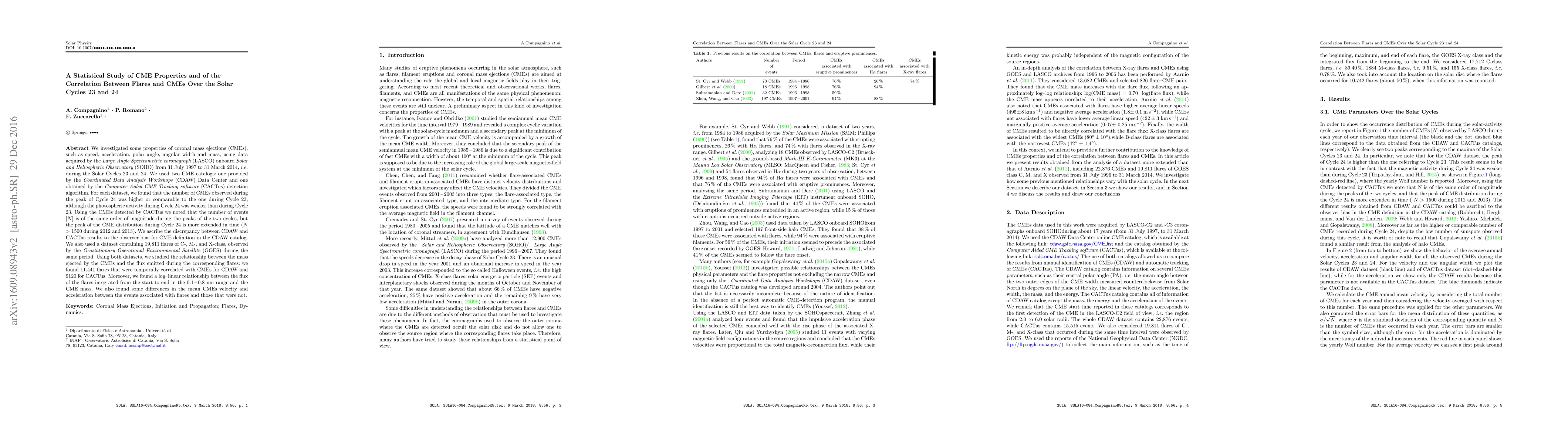 This study analyzed coronal mass ejections (CMEs) during Solar Cycles 23 and 24, finding that more CMEs occurred in Cycle 24 despite weaker solar activity, and a significant correlation between CME mass and flare flux.