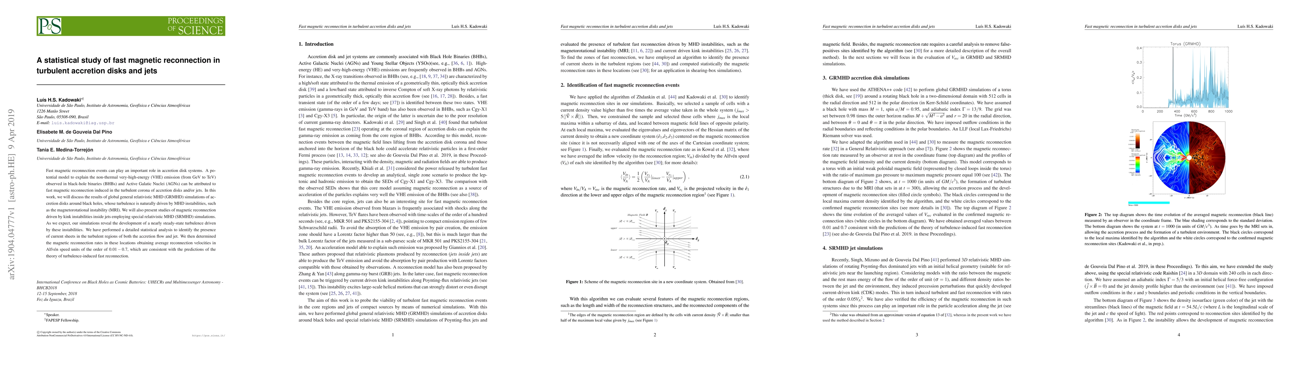 This paper presents global simulations of turbulent accretion disks and jets, revealing fast magnetic reconnection events driven by MHD instabilities. Statistical analysis identifies current sheets and determines reconnection rates, showing velocities consistent with turbulence-induced fast reconnection theory.