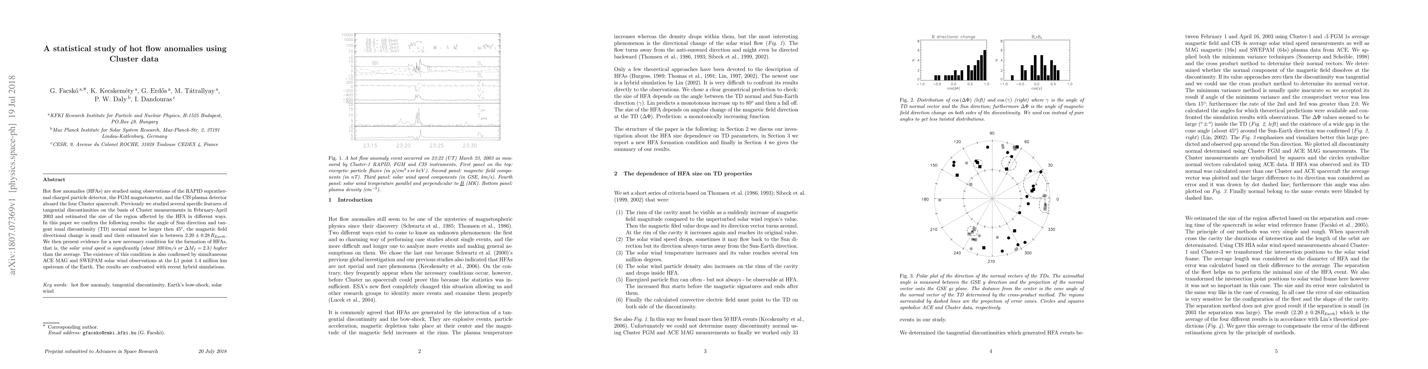 Hot flow anomalies (HFAs) are studied using observations of the RAPID suprathermal charged particle detector, the FGM magnetometer, and the CIS plasma detector aboard the four Cluster spacecraft. Previously, we studied several specific features of tangential discontinuities on the basis of Cluster measurements in February-April 2003. In this paper, we confirm the following results: the angle between the Sun direction and the tangentional discontinuity (TD) normal is larger than 45{\deg} during HFAs, the magnetic field directional change is large. We then present evidence for a new necessary condition for the formation of HFAs, that is, the solar wind speed is significantly ( about 200 km/s or dMf=2.3) higher than the long-term average. The existence of this condition is also confirmed by simultaneous ACE MAG and SWEPAM solar wind observations at the L1 point 1.4 million km upstream of the Earth. The results are compared with recent hybrid simulations.