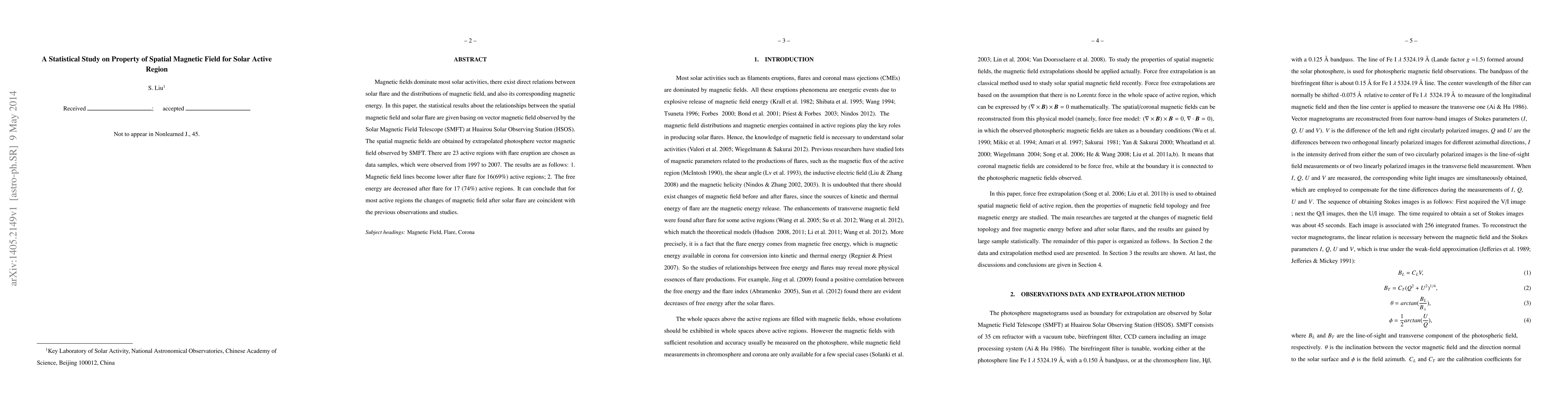 This paper statistically analyzes the relationship between spatial magnetic fields and solar flares using data from the Solar Magnetic Field Telescope. It finds that 69% of active regions show lower magnetic field lines post-flare, and 74% exhibit decreased magnetic energy, confirming previous observations of post-flare magnetic field changes.