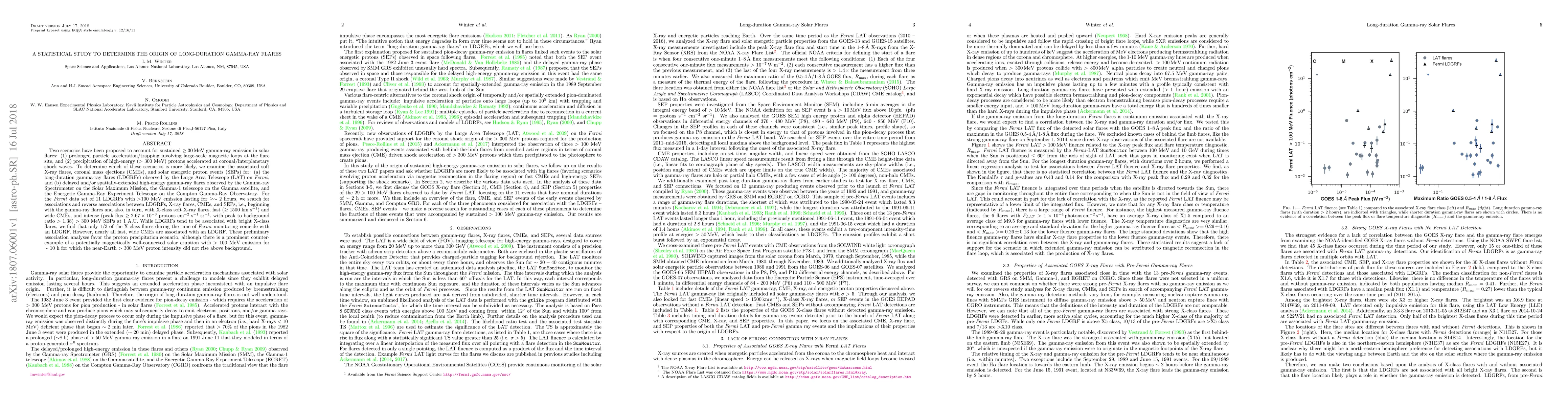 This study investigates the origin of long-duration gamma-ray flares (LDGRFs) in solar flares, comparing the likelihood of prolonged particle acceleration at the flare site versus high-energy proton precipitation from coronal shocks. Preliminary findings suggest that while LDGRFs often coincide with bright X-class flares, nearly all fast, wide coronal mass ejections are associated with LDGRFs, favoring the proton precipitation scenario.