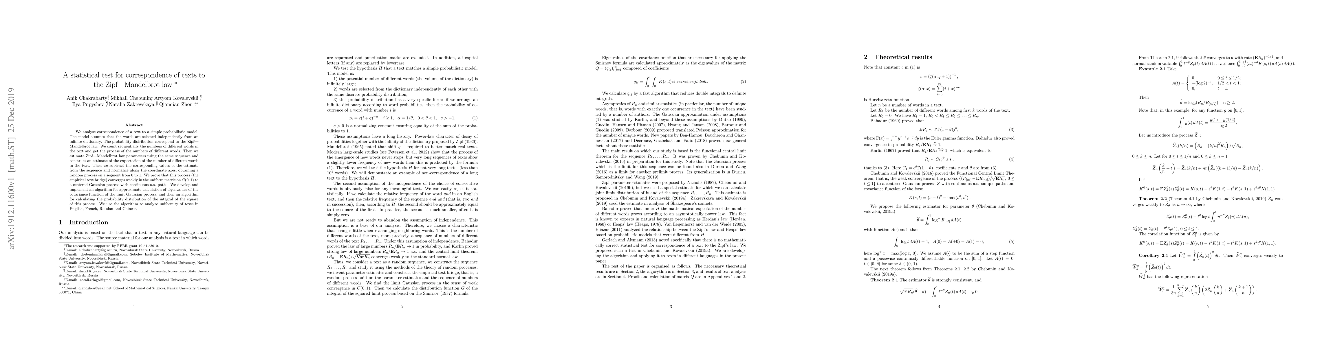 We analyse correspondence of a text to a simple probabilistic model. The model assumes that the words are selected independently from an infinite dictionary. The probability distribution correspond to the Zipf---Mandelbrot law. We count sequentially the numbers of different words in the text and get the process of the numbers of different words. Then we estimate Zipf---Mandelbrot law parameters using the same sequence and construct an estimate of the expectation of the number of different words in the text. Then we subtract the corresponding values of the estimate from the sequence and normalize along the coordinate axes, obtaining a random process on a segment from 0 to 1. We prove that this process (the empirical text bridge) converges weakly in the uniform metric on $C (0,1)$ to a centered Gaussian process with continuous a.s. paths. We develop and implement an algorithm for approximate calculation of eigenvalues of the covariance function of the limit Gaussian process, and then an algorithm for calculating the probability distribution of the integral of the square of this process. We use the algorithm to analyze uniformity of texts in English, French, Russian and Chinese.