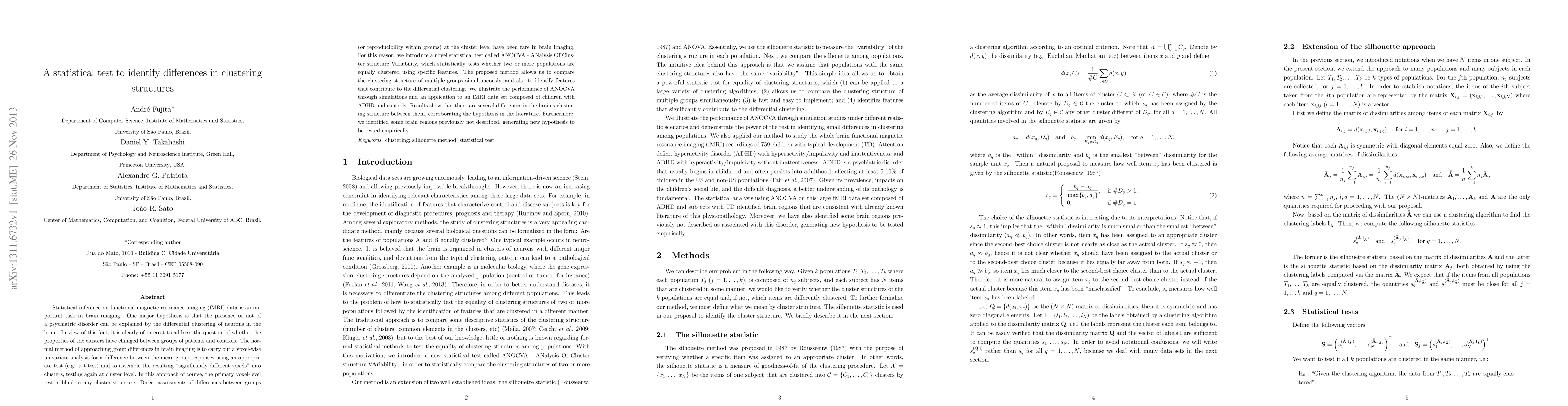 Statistical inference on functional magnetic resonance imaging (fMRI) data is an important task in brain imaging. One major hypothesis is that the presence or not of a psychiatric disorder can be explained by the differential clustering of neurons in the brain. In view of this fact, it is clearly of interest to address the question of whether the properties of the clusters have changed between groups of patients and controls. The normal method of approaching group differences in brain imaging is to carry out a voxel-wise univariate analysis for a difference between the mean group responses using an appropriate test (e.g. a t-test) and to assemble the resulting "significantly different voxels" into clusters, testing again at cluster level. In this approach of course, the primary voxel-level test is blind to any cluster structure. Direct assessments of differences between groups (or reproducibility within groups) at the cluster level have been rare in brain imaging. For this reason, we introduce a novel statistical test called ANOCVA - ANalysis Of Cluster structure Variability, which statistically tests whether two or more populations are equally clustered using specific features. The proposed method allows us to compare the clustering structure of multiple groups simultaneously, and also to identify features that contribute to the differential clustering. We illustrate the performance of ANOCVA through simulations and an application to an fMRI data set composed of children with ADHD and controls. Results show that there are several differences in the brain's clustering structure between them, corroborating the hypothesis in the literature. Furthermore, we identified some brain regions previously not described, generating new hypothesis to be tested empirically.