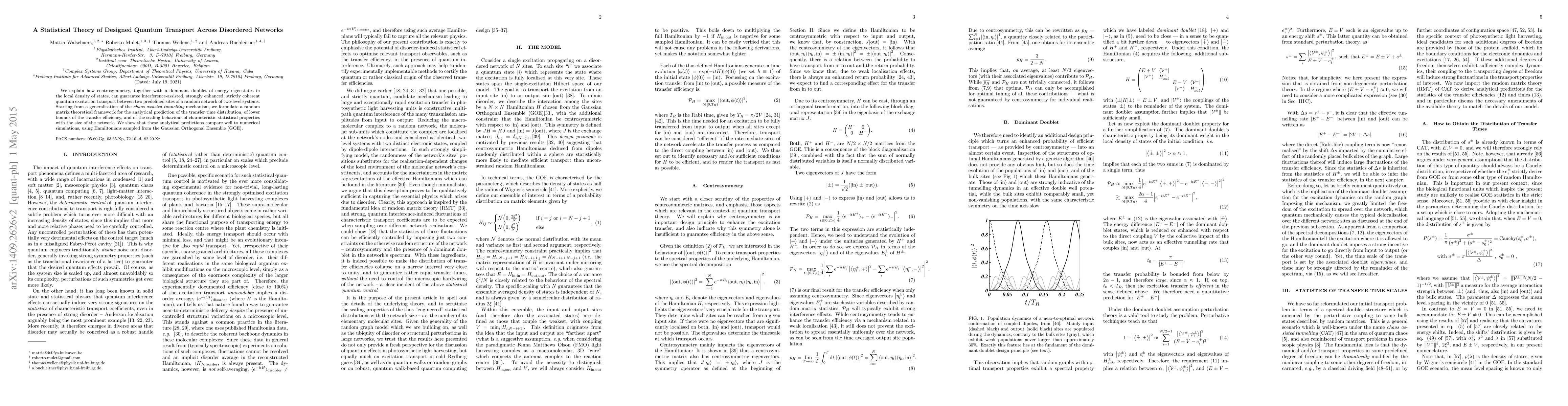 This paper develops a statistical theory for quantum transport across disordered networks, showing that centrosymmetry and a dominant doublet in the local density of states can enable strongly enhanced, coherent quantum excitation transport. It introduces a random matrix theoretical framework to predict transfer time distribution, transfer efficiency, and scaling behavior in such networks.