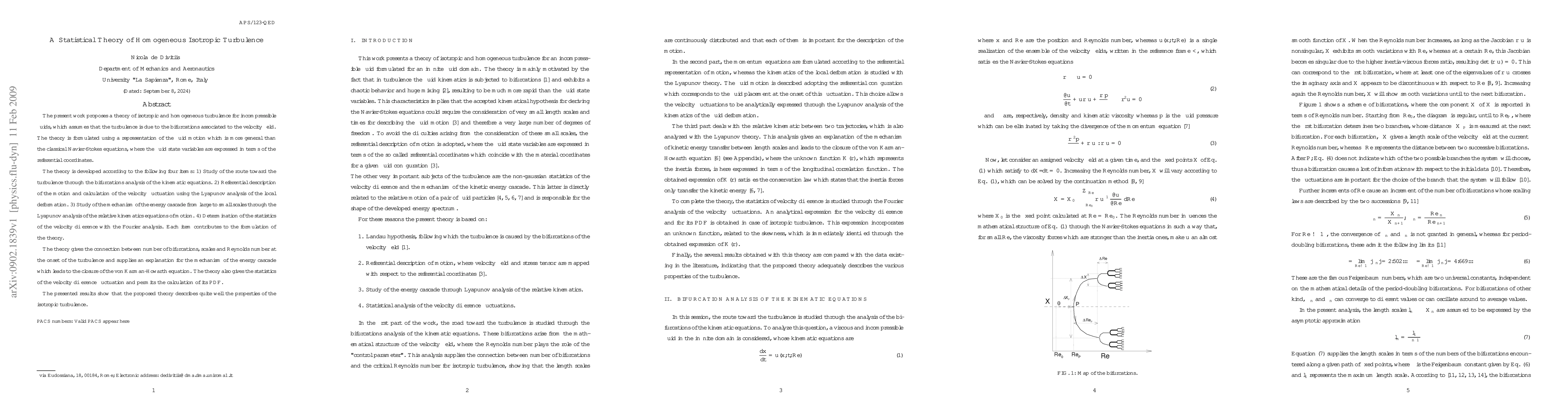 This paper proposes a statistical theory for isotropic and homogeneous turbulence in incompressible fluids, linking turbulence onset to bifurcations in the velocity field. The theory provides insights into the energy cascade mechanism and the statistics of velocity differences, offering a comprehensive description of turbulence properties.