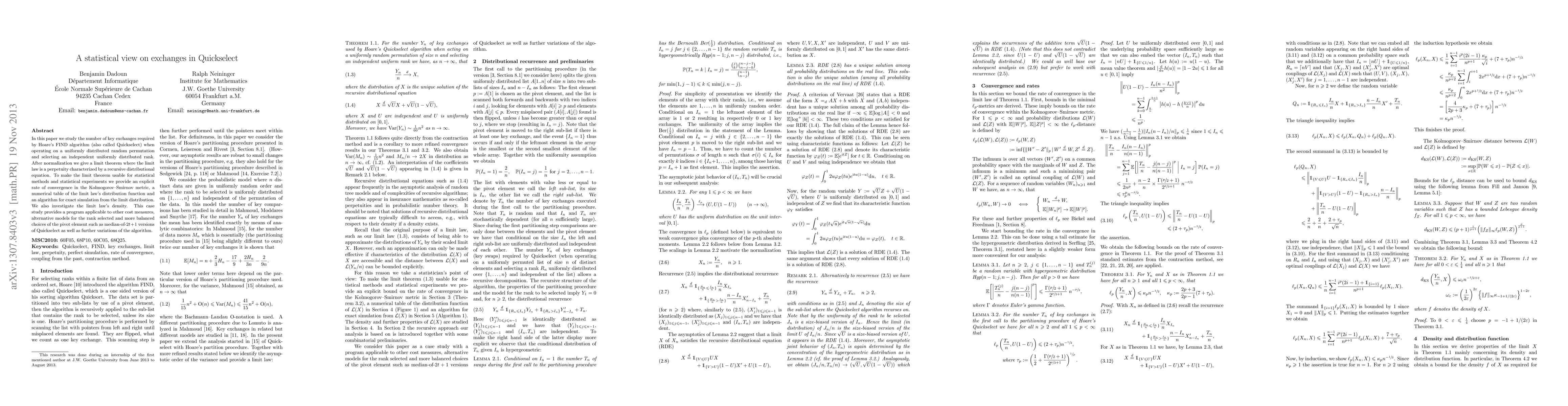 In this paper we study the number of key exchanges required by Hoare's FIND algorithm (also called Quickselect) when operating on a uniformly distributed random permutation and selecting an independent uniformly distributed rank. After normalization we give a limit theorem where the limit law is a perpetuity characterized by a recursive distributional equation. To make the limit theorem usable for statistical methods and statistical experiments we provide an explicit rate of convergence in the Kolmogorov--Smirnov metric, a numerical table of the limit law's distribution function and an algorithm for exact simulation from the limit distribution. We also investigate the limit law's density. This case study provides a program applicable to other cost measures, alternative models for the rank selected and more balanced choices of the pivot element such as median-of-$2t+1$ versions of Quickselect as well as further variations of the algorithm.