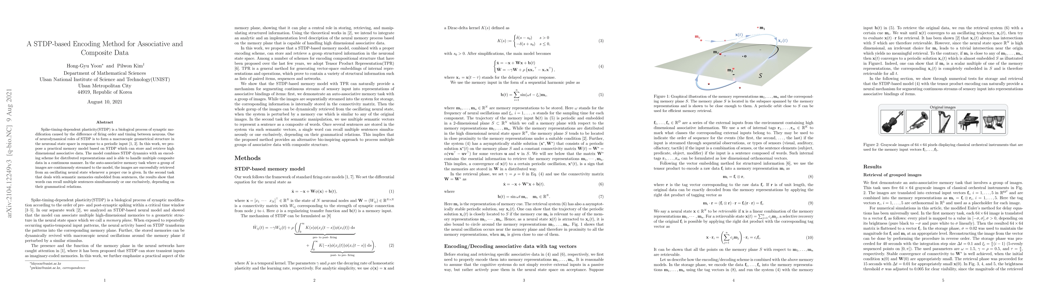 Spike-timing-dependent plasticity(STDP) is a biological process of synaptic modification caused by the difference of firing order and timing between neurons. One of the neurodynamical roles of STDP is to form a macroscopic geometrical structure in the neuronal state space in response to a periodic input. This work proposes a practical memory model based on STDP that can store and retrieve high-dimensional associative data. The model combines STDP dynamics with an encoding scheme for distributed representations and can handle multiple composite data in a continuous manner. In the auto-associative memory task where a group of images is continuously streamed to the model, the images are successfully retrieved from an oscillating neural state whenever a proper cue is given. In the second task that deals with semantic memories embedded from sentences, the results show that words can recall multiple sentences simultaneously or one exclusively, depending on their grammatical relations.
