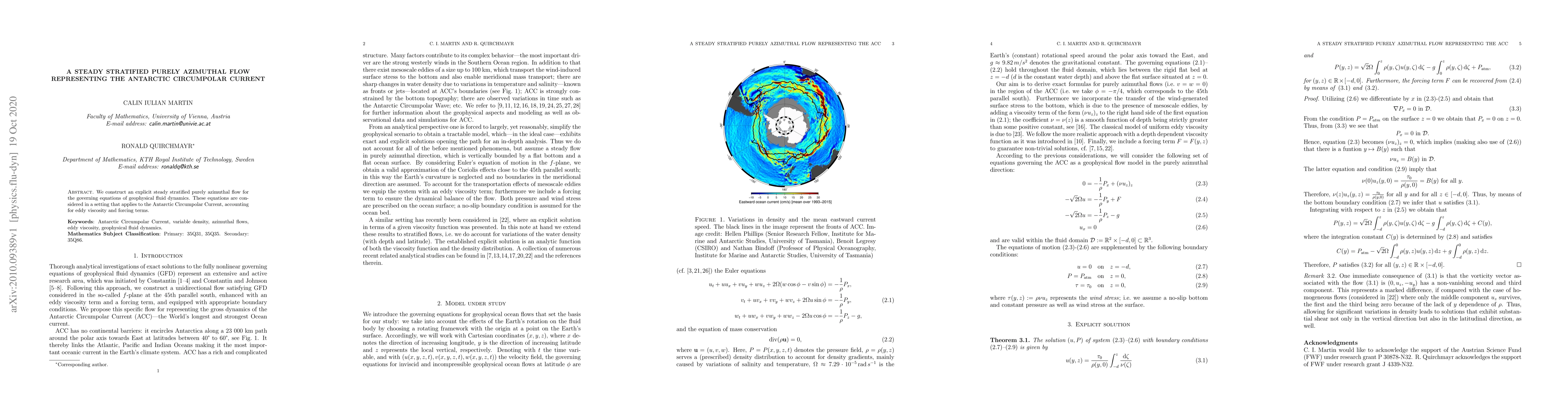 We construct an explicit steady stratified purely azimuthal flow for the governing equations of geophysical fluid dynamics. These equations are considered in a setting that applies to the Antarctic Circumpolar Current, accounting for eddy viscosity and forcing terms.