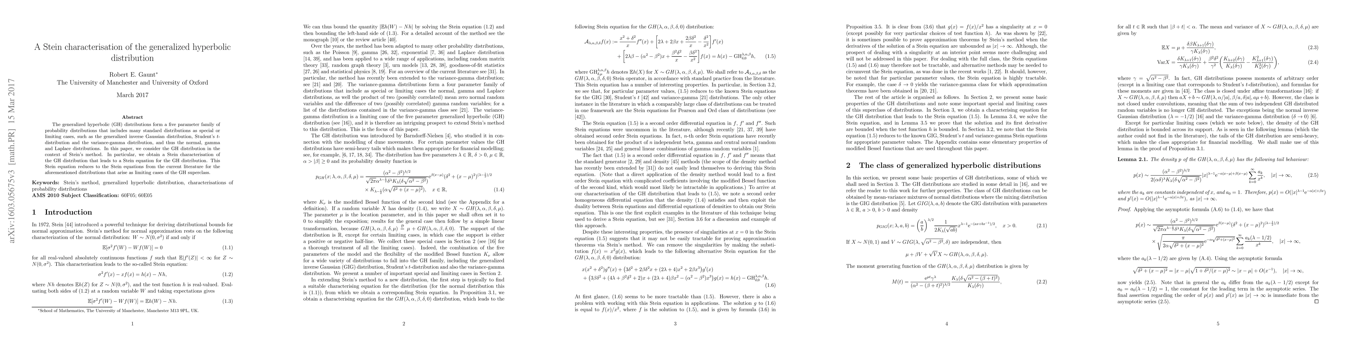 The generalized hyperbolic (GH) distributions form a five parameter family of probability distributions that includes many standard distributions as special or limiting cases, such as the generalized inverse Gaussian distribution, Student's $t$-distribution and the variance-gamma distribution, and thus the normal, gamma and Laplace distributions. In this paper, we consider the GH distribution in the context of Stein's method. In particular, we obtain a Stein characterisation of the GH distribution that leads to a Stein equation for the GH distribution. This Stein equation reduces to the Stein equations from the current literature for the aforementioned distributions that arise as limiting cases of the GH superclass.