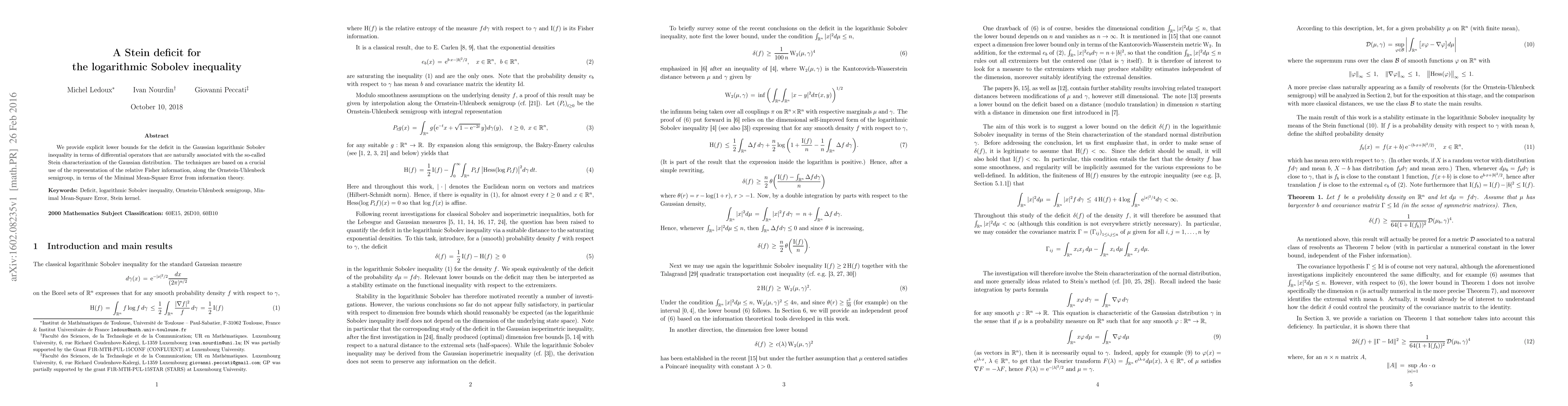 This paper establishes explicit lower bounds for the deficit in the Gaussian logarithmic Sobolev inequality using differential operators tied to the Stein characterization of the Gaussian distribution. It leverages the representation of relative Fisher information through the Ornstein-Uhlenbeck semigroup and Minimal Mean-Square Error from information theory.