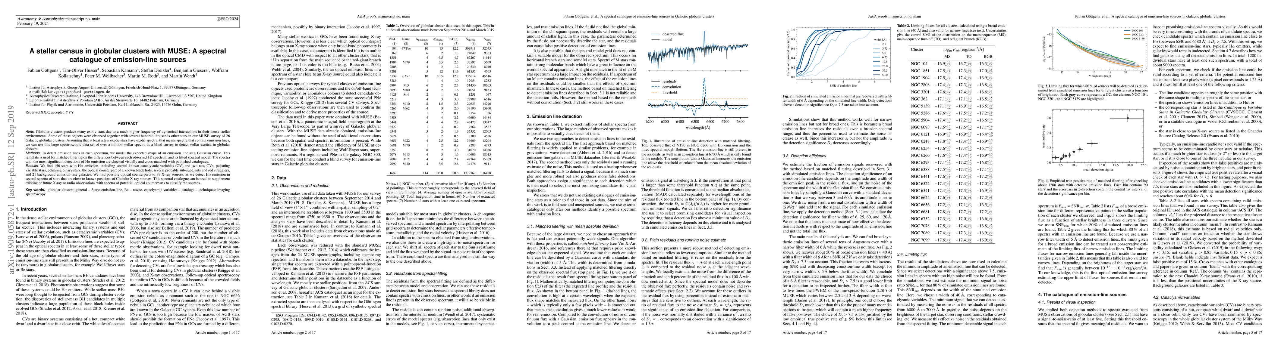 Globular clusters produce many exotic stars due to a much higher frequency of dynamical interactions in their dense stellar environments. Some of these objects were observed together with several hundred thousands other stars in our MUSE survey of 26 Galactic globular clusters. Assuming that at least a few exotic stars have exotic spectra, that means spectra that contain emission lines, we can use this large spectroscopic data set of over a million stellar spectra as a blind survey to detect stellar exotica in globular clusters. To detect emission lines in each spectrum, we model the expected shape of an emission line as a Gaussian curve. This template is used for matched filtering on the differences between each observed 1D spectrum and its fitted spectral model. The spectra with the most significant detections of H$\alpha$ emission are checked visually and cross-matched with published catalogues. We find 156 stars with H$\alpha$ emission, including several known cataclysmic variables (CV) and two new CVs, pulsating variable stars, eclipsing binary stars, the optical counterpart of a known black hole, several probable sub-subgiants and red stragglers, and 21 background emission-line galaxies. We find possible optical counterparts to 39 X-ray sources, as we detect H$\alpha$ emission in several spectra of stars that are close to known positions of Chandra X-ray sources. This spectral catalogue can be used to supplement existing or future X-ray or radio observations with spectra of potential optical counterparts to classify the sources.