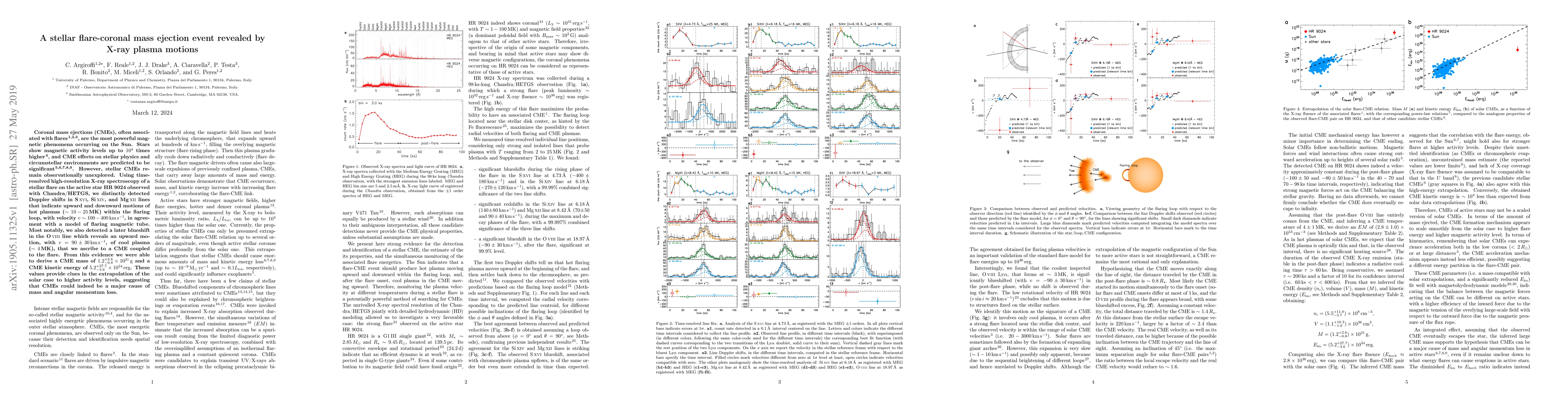 Coronal mass ejections (CMEs), often associated with flares, are the most powerful magnetic phenomena occurring on the Sun. Stars show magnetic activity levels up to 10^4 times higher, and CME effects on stellar physics and circumstellar environments are predicted to be significant. However, stellar CMEs remain observationally unexplored. Using time-resolved high-resolution X-ray spectroscopy of a stellar flare on the active star HR 9024 observed with Chandra/HETGS, we distinctly detected Doppler shifts in S XVI, Si XIV, and Mg XII lines that indicate upward and downward motions of hot plasmas (~10-25 MK) within the flaring loop, with velocity v~100-400 km/s, in agreement with a model of flaring magnetic tube. Most notably, we also detected a later blueshift in the O VIII line which reveals an upward motion, with v=90+/-30 km/s, of cool plasma (~4 MK), that we ascribe to a CME coupled to the flare. From this evidence we were able to derive a CME mass of 1x10^21 g and a CME kinetic energy of 5x10^34 erg. These values provide clues in the extrapolation of the solar case to higher activity levels, suggesting that CMEs could indeed be a major cause of mass and angular momentum loss.