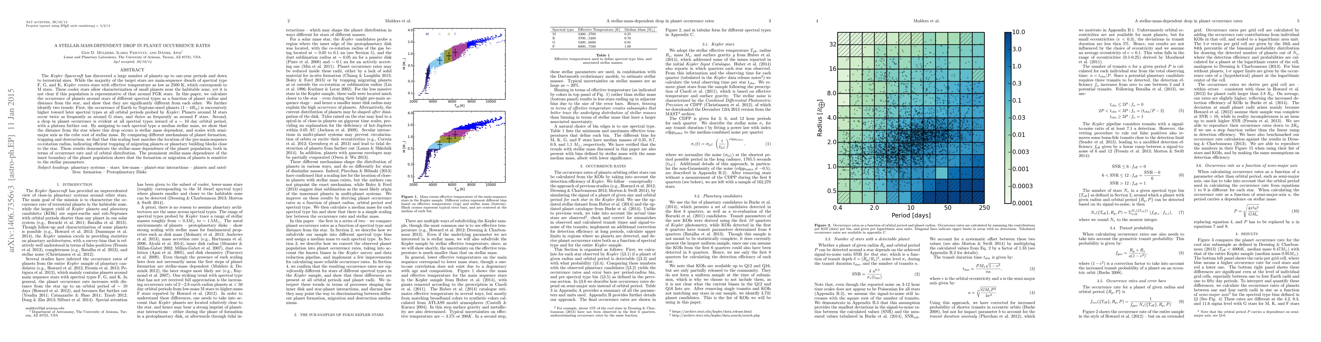 This paper investigates planet occurrence rates around stars of different spectral types using Kepler data, revealing that planets are more frequent around cooler M stars compared to warmer F and G stars. It identifies a stellar-mass-dependent drop in planet occurrence within 10 days orbital period, correlating this drop with the pre-main-sequence co-rotation radius, suggesting efficient trapping of migrating planets.