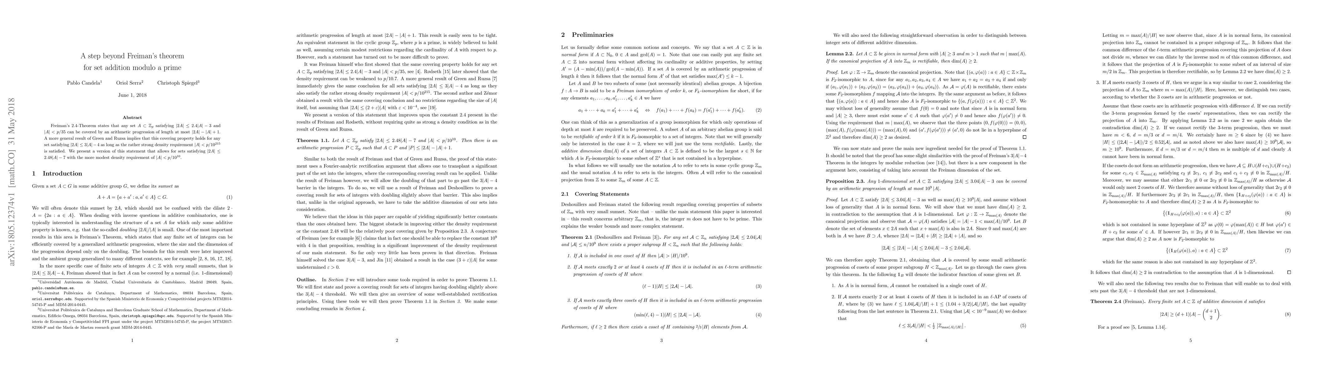 Freiman's 2.4-Theorem states that any set $A \subset \mathbb{Z}_p$ satisfying $|2A| \leq 2.4|A| - 3 $ and $|A| < p/35$ can be covered by an arithmetic progression of length at most $|2A| - |A| + 1$. A more general result of Green and Ruzsa implies that this covering property holds for any set satisfying $|2A| \leq 3|A| - 4$ as long as the rather strong density requirement $|A| < p/10^{215}$ is satisfied. We present a version of this statement that allows for sets satisfying $|2A| \leq 2.48|A| - 7$ with the more modest density requirement of $|A| < p/10^{10}$.